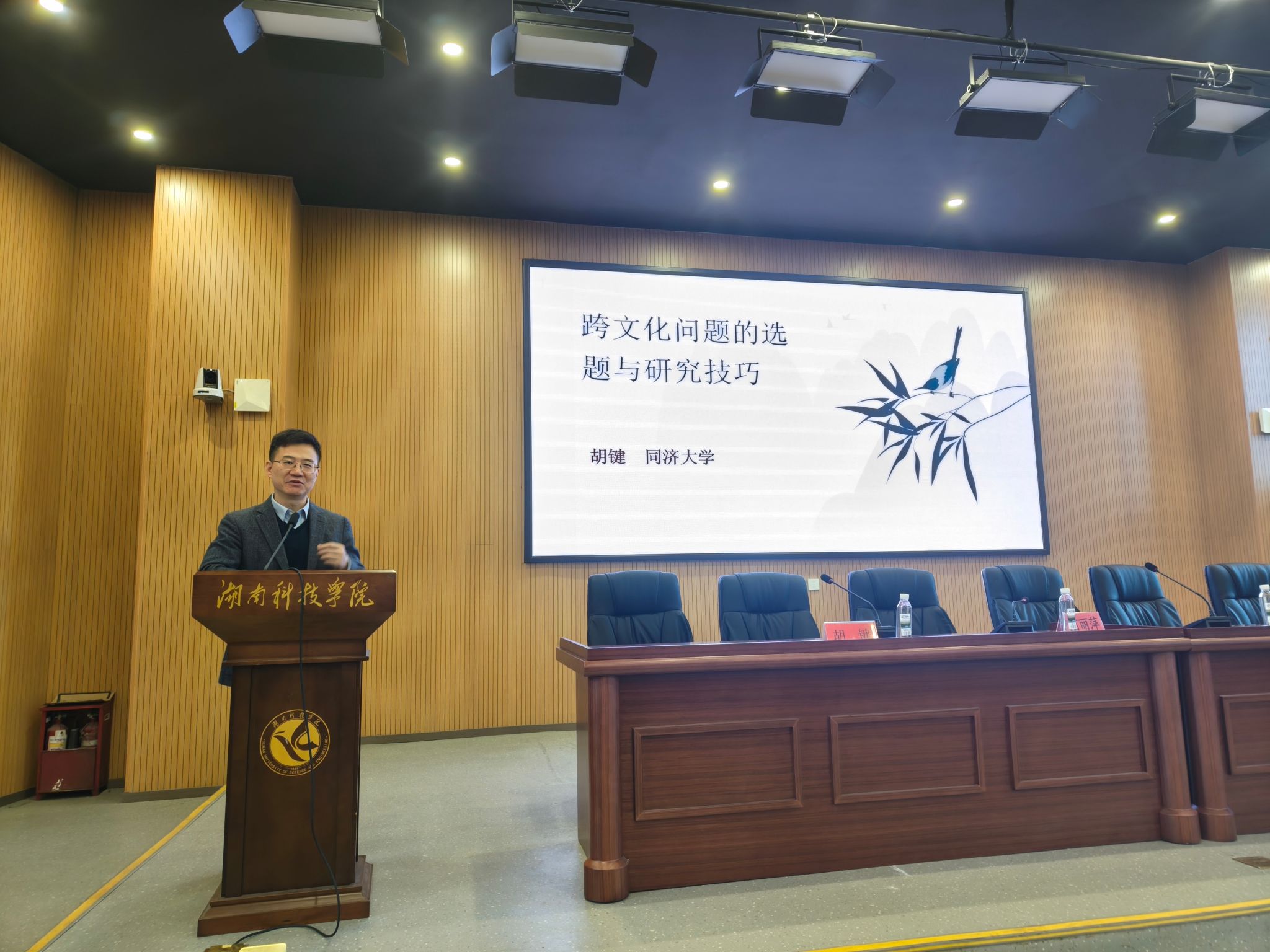 本网讯(通讯员 王薇)11月18日下午,同济大学胡键教授、国防科技大学柳晓教授应邀分别为外国语全体职工做了题为“跨文化问题的选题与研究技巧”和“文学想象,认知科学与国家安全——跨学科视域下的美国文学战争叙事研究”的学术讲座。此次讲座由外国语学院院长何丽萍教授主持,外国语学院全体教师积极参与。