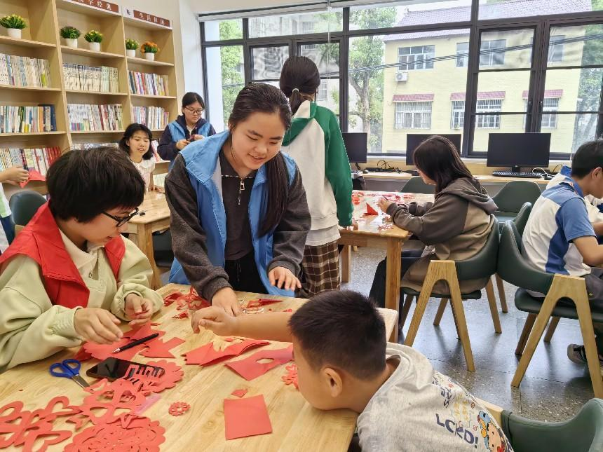 图为志愿者教同学们剪纸艺术