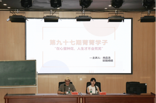 (通讯员 曾胜凤 摄影 陈昊)5月14日晚19:30,外国语学院于博雅楼东三报告厅举办了第九十七期菁菁学子讲坛。主题为“在心里种花,人生才不会荒芜”。本期讲坛的主讲嘉宾为商英2002班尚嘉浩、商英2002班欧阳倚晴。本期讲坛共有190名同学主动报名参加。