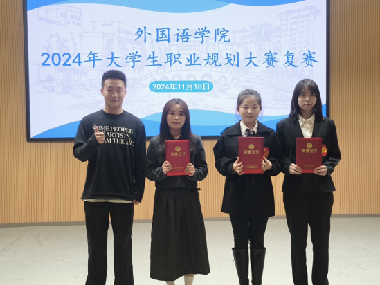 (通讯员 欧玉莹 摄影 李灿) 11月18日晚19: 10,外国语学院于博雅楼东三报告厅举办了2024年大学生职业规划大赛复赛。本次比赛评委嘉宾有外国语学院学工办主任、2024级辅导员陈小峰,外国语学院学工办副主任、2024级辅导员王素芳,外国语学院团总支书记、2023级辅导员李政锴,2022级辅导员黄雅丽,2021级辅导员蔡卓。本次比赛共有22名选手。