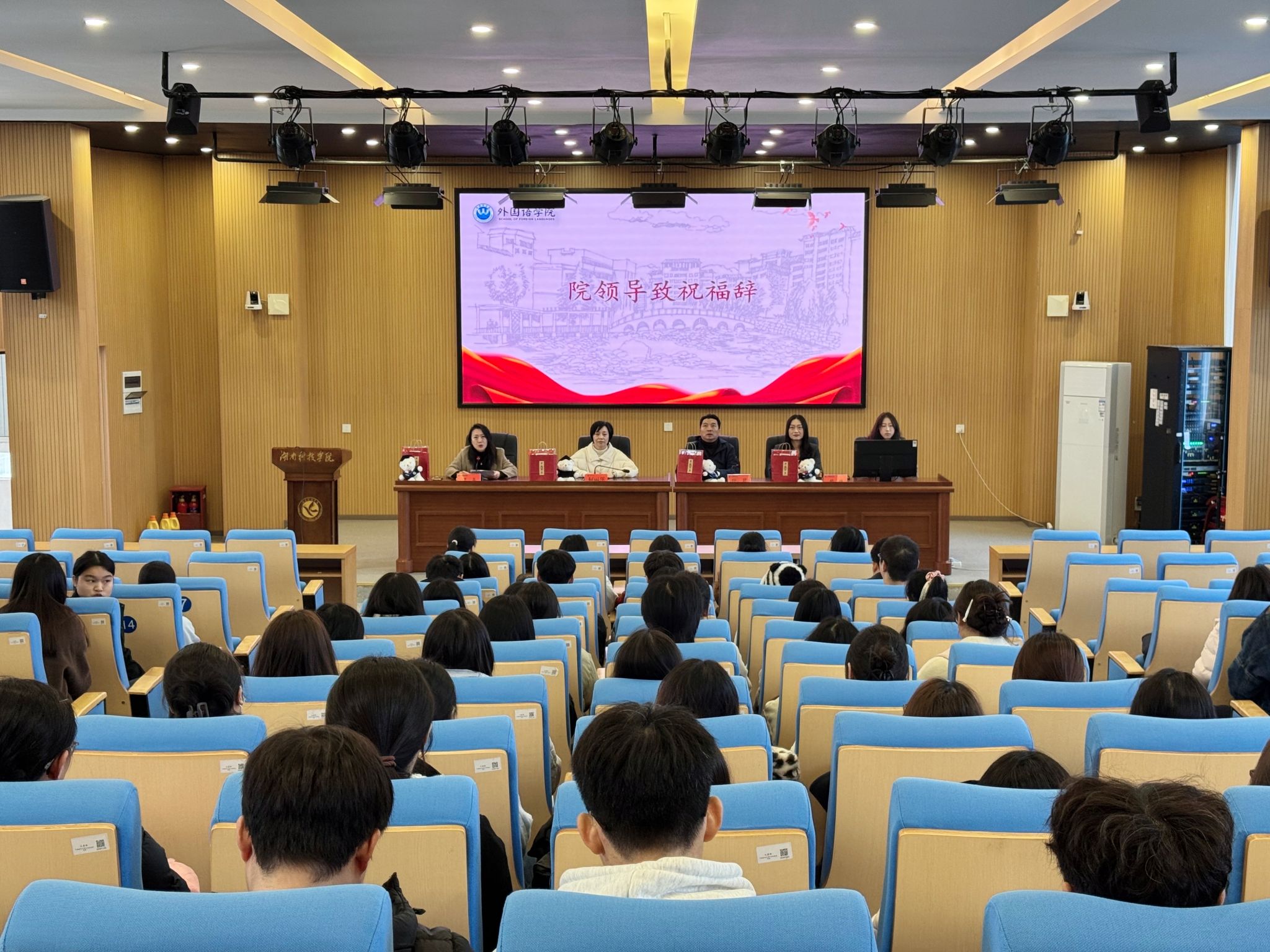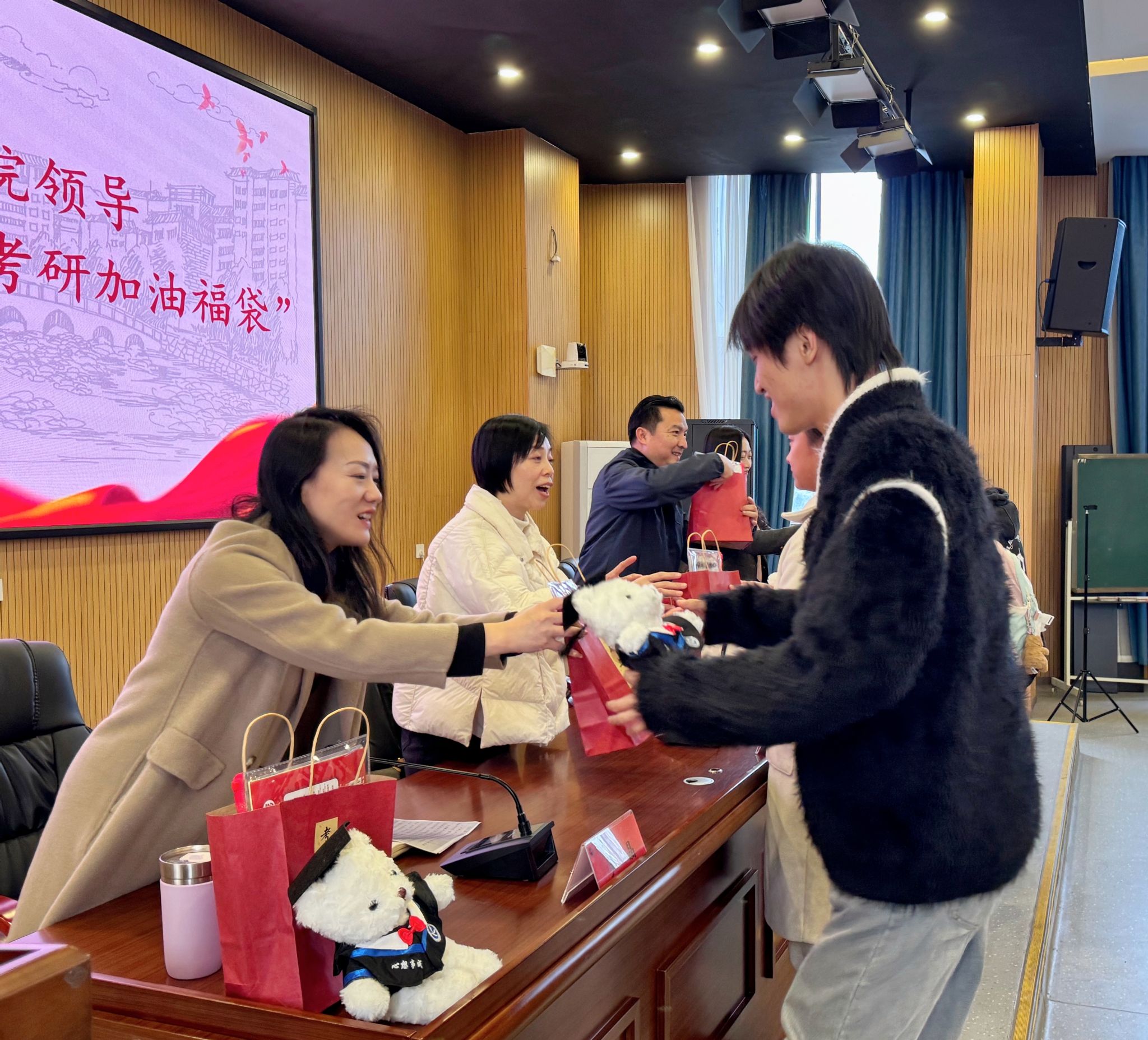 院领导亲手将一份份满载心意的“能量包”递到学生手中。包内含“心想事成” 湘科院小熊、外院专属笔记本、学校考研文具及学弟学妹手写祝福明信片,礼物兼具实用性与情感温度,承载着外院大家庭特有的关怀与传承。