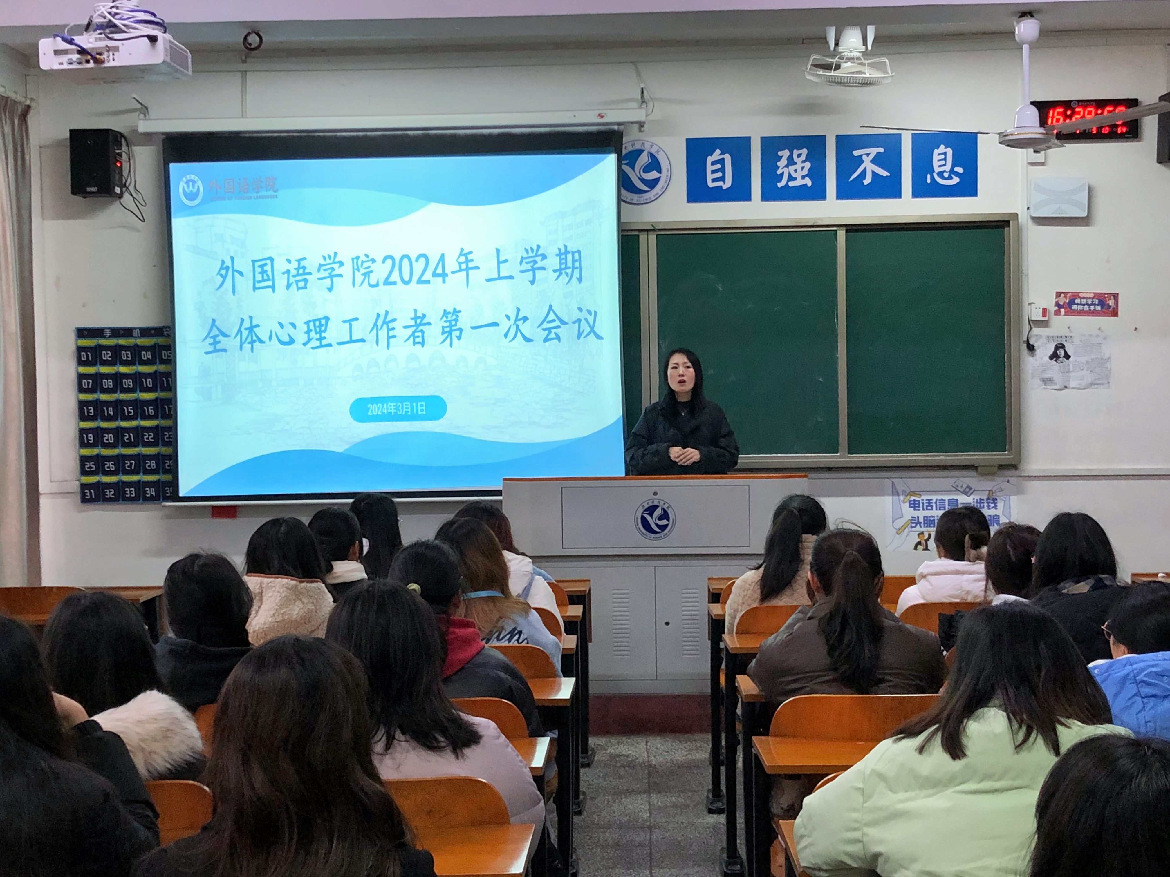 本网讯 外国语学院为进一步加强学生心理健康工作,提升心理信息员的业务能力和责任意识,3月1日,外国语学院召开了2024年心理工作者第一次会议。党总支副书记罗晶,心理专干黄雅丽,各班心理委员、朋辈辅导员和学生会心理部参会。