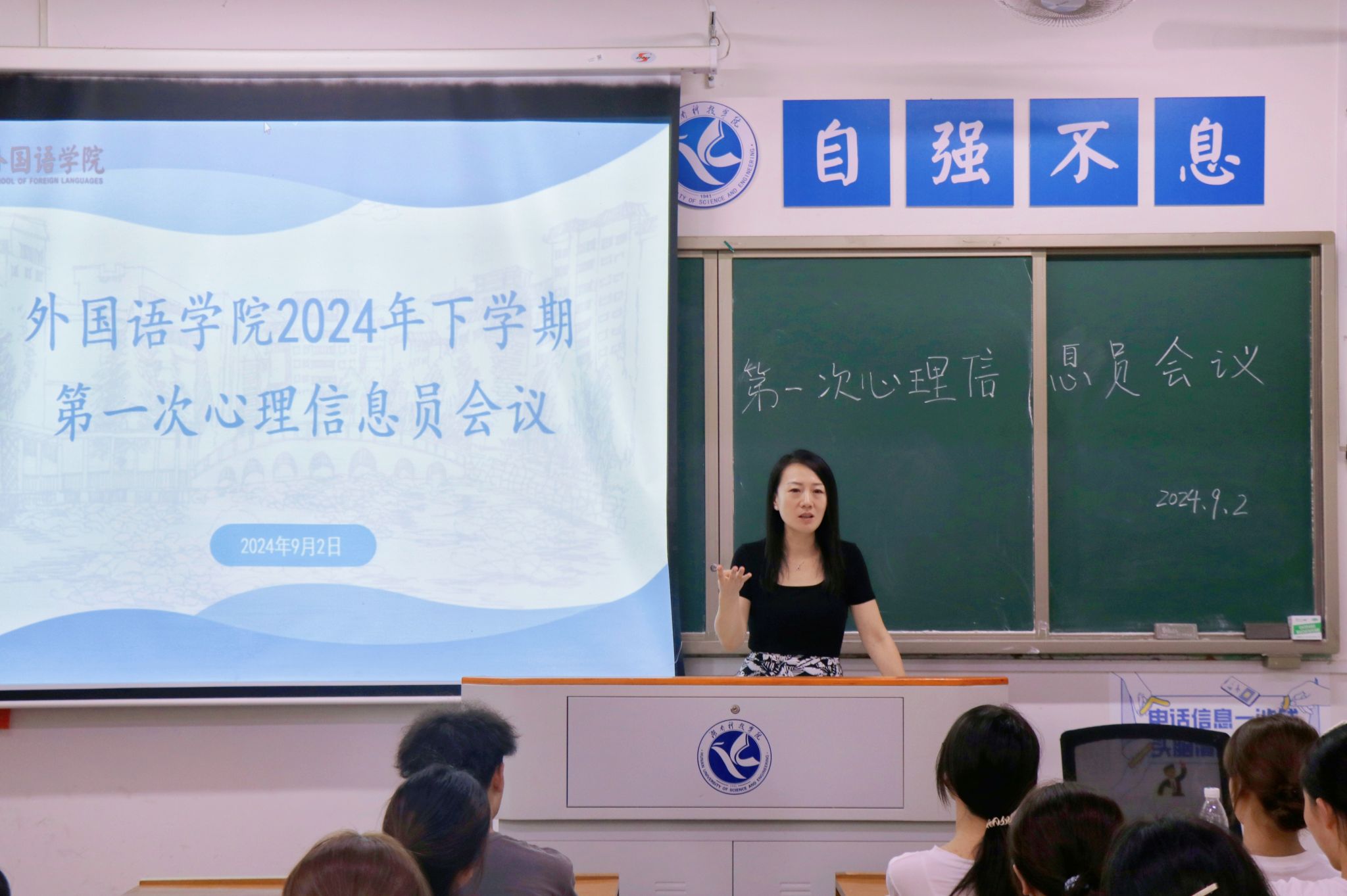 本网讯(通讯员 黄雅丽)为进一步开展新学期心理健康教育工作,9月2日,外国语学院举行新学期心理工作者会议。党总支副书记罗晶,心理专干黄雅丽,各班心理委员、朋辈辅导员和学生会心理部参会。