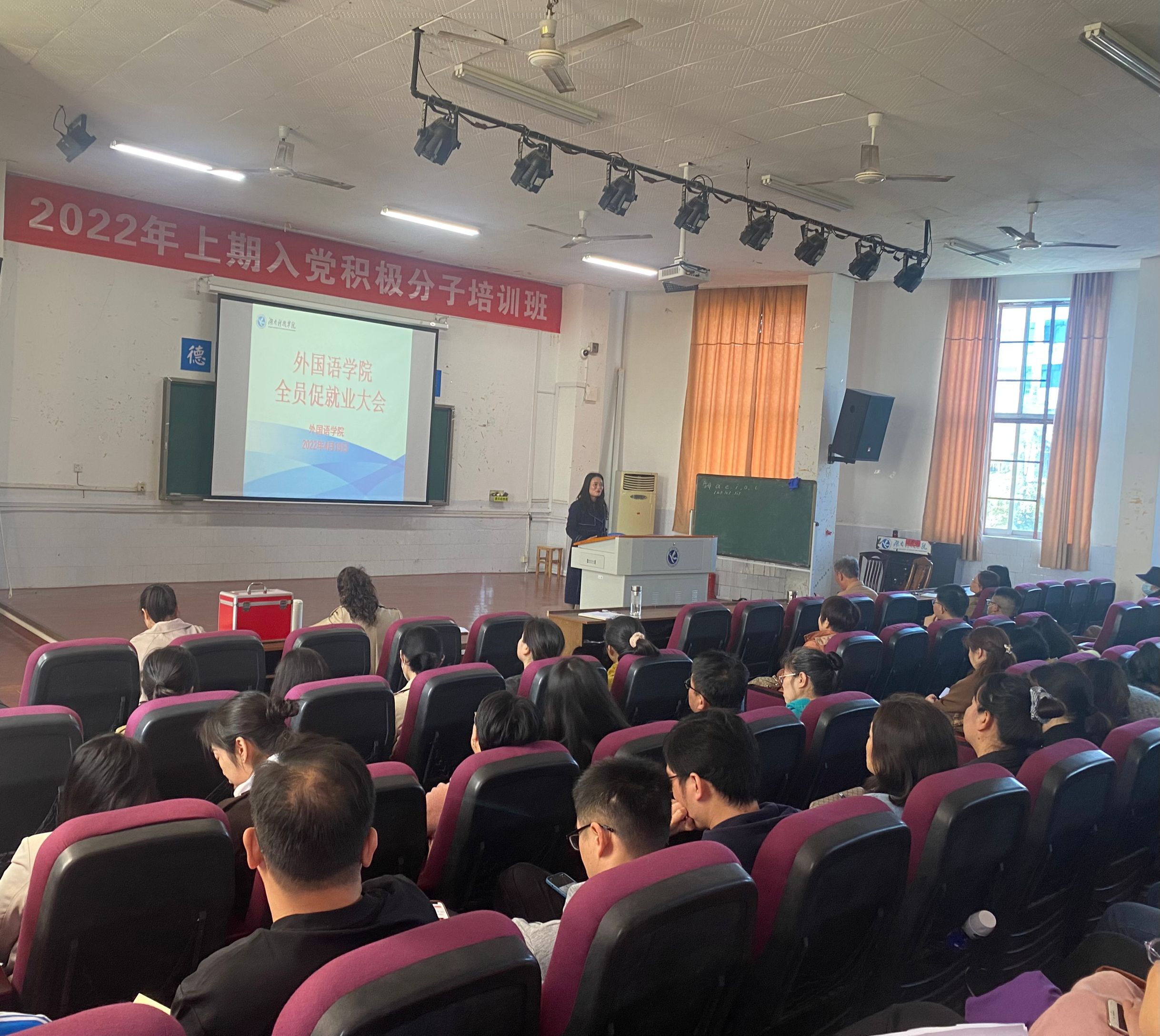 (通讯员 何佳艳)4月19日下午,外国语学院召开2022届毕业生全员促就业大会。党总支书记张剑主持会议,外国语学院全体教职工参会 。