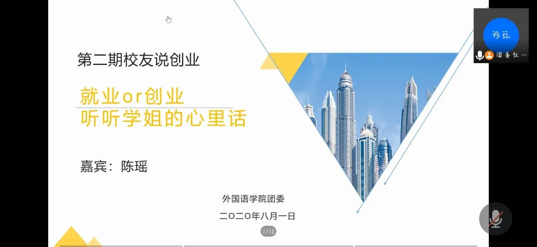 本网讯(通讯员 沈叶恒)大众创业,万众创新。为激发我院学生的创新创业精神,鼓励学生进行创业实践,“校友说创业”第二期“就业or创业,听听学姐的心里话”于8月1日晚7:30在腾讯会议APP上线上开展。外国语学院院长欧华恩教授、党总支副书记罗晶、团委书记刘罗、学生会第二党支部书记王素芳应邀参与此活动,本期的主讲人是09级优秀校友陈瑶(曾任学生会宣传部及心理部的副部长,现任深圳市辉耀电气技术有限公司执行董事、总经理)。共七十余人主动报名参与此活动。