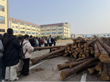 为深化产教融合,提升学生专业实践能力,12月9日下午,在我院副院长黄昊文带领下,商务英语系主任、两位专任教师及2023级商务英语专业全体学生前往湖南九州木业有限公司,开展专业认知见习活动。本次活动旨在让学生亲身接触外贸实体行业,了解木材加工贸易的全流程,将课堂理论知识与实际商业运作相结合。