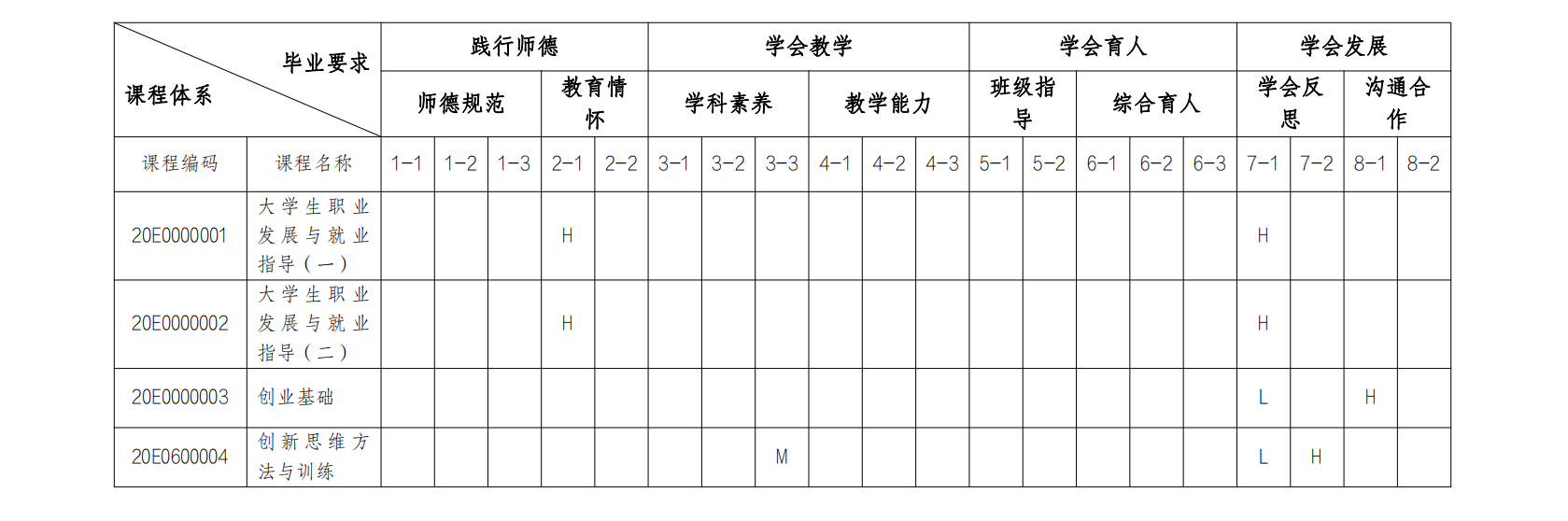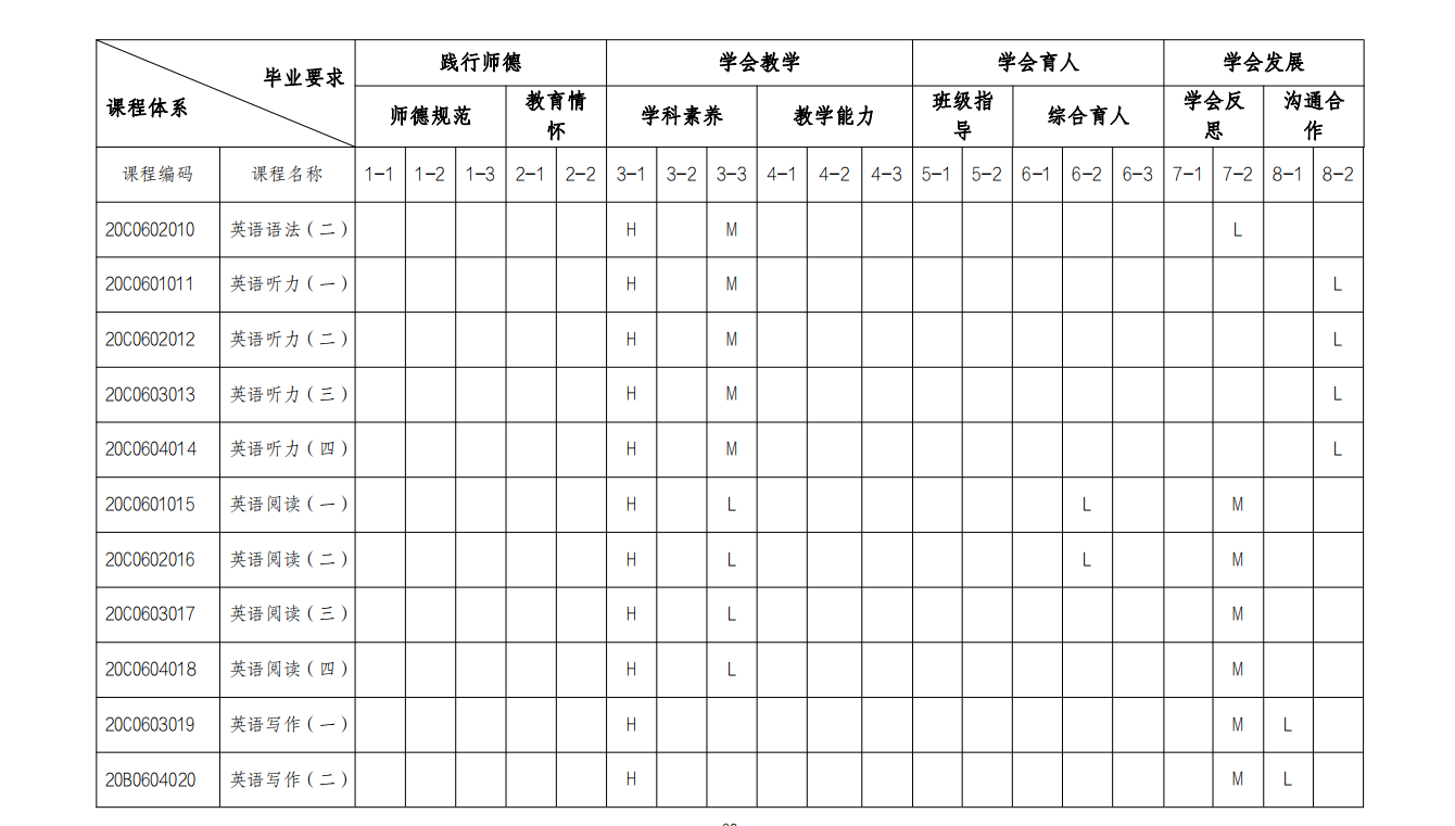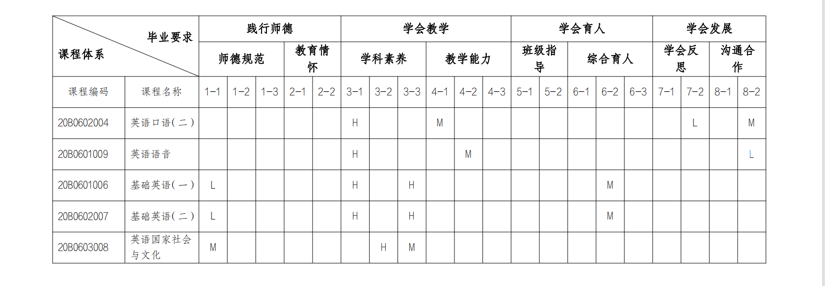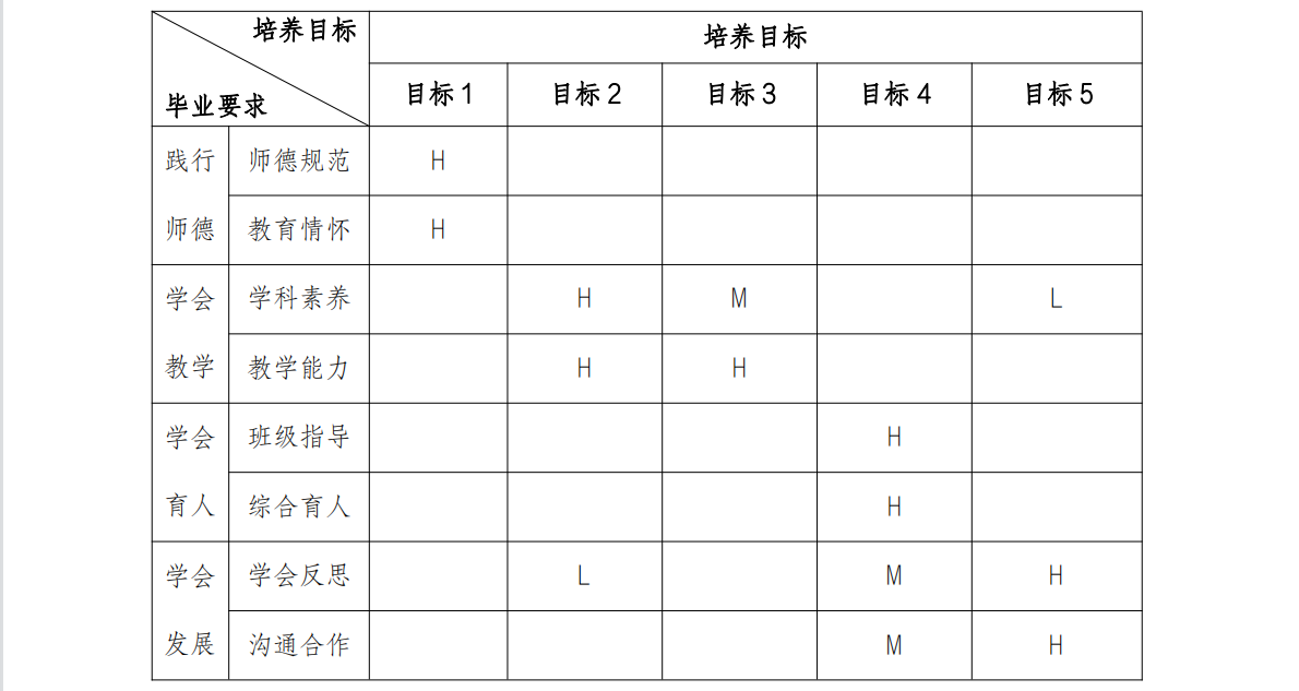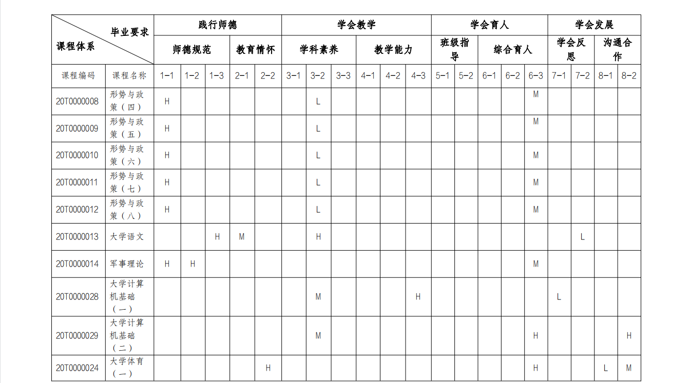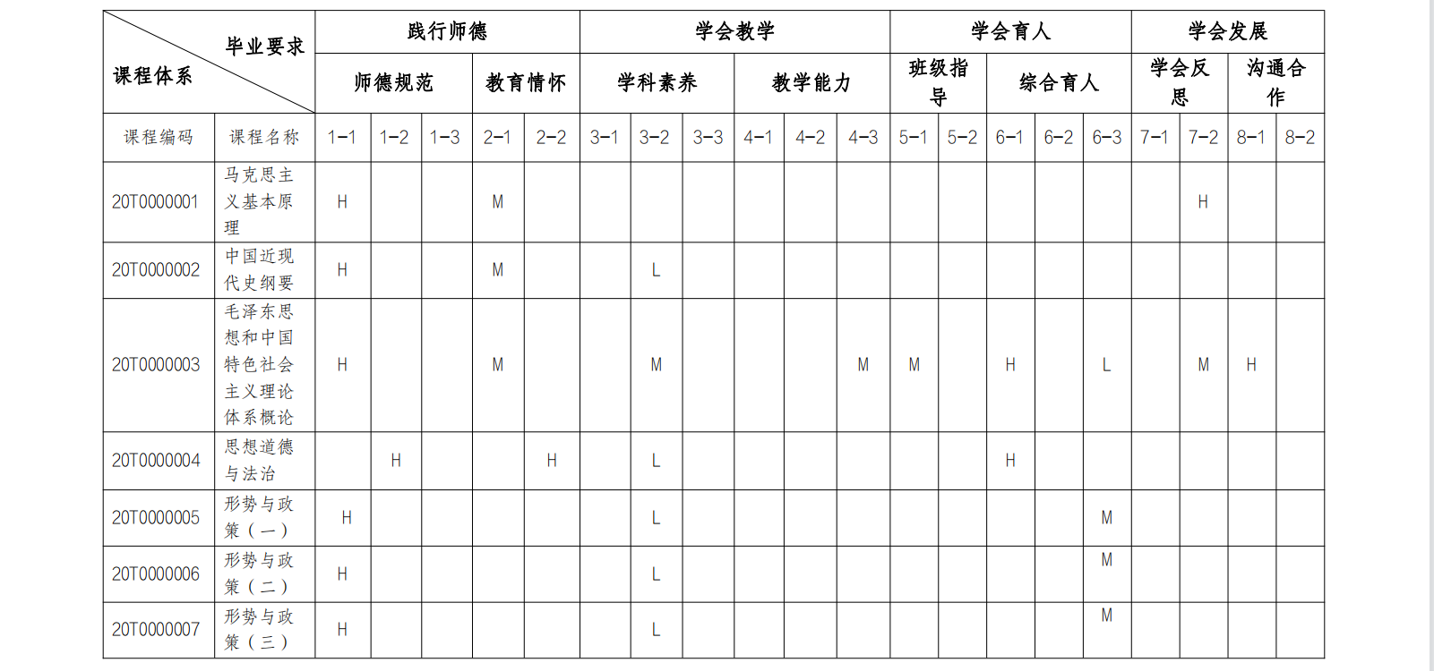 注:根据毕业要求与课程目标、课程内容与课程目标的对应关系编制本表,“课程体系支撑毕业要求实现关系矩阵”应覆盖所有 必修环节,开设各课程(理论课程、实践课程)应对毕业要求达成具有一定支撑作用。根据课程对各项毕业要求的支撑强度分别用“H (高)、M(中)、L(弱)”表示,支撑强度的含义是:该课程覆盖毕业要求指标点的多寡,H 至少覆盖 80%,M 至少覆盖 50%,L 至 少覆盖 30%。不必全部支撑,不可能全部支撑,须明确高支撑。