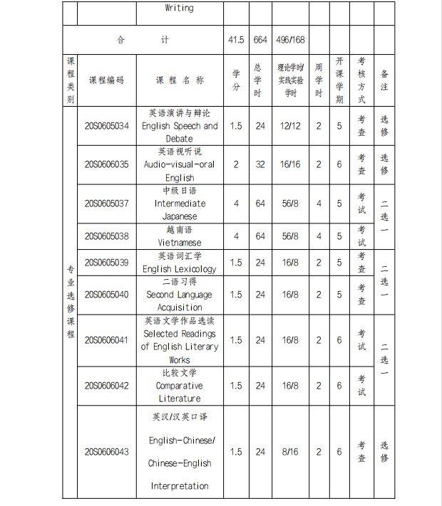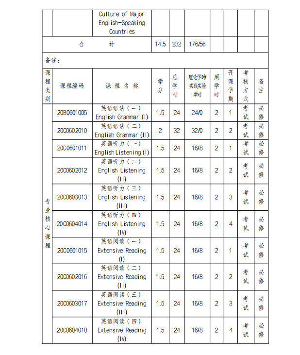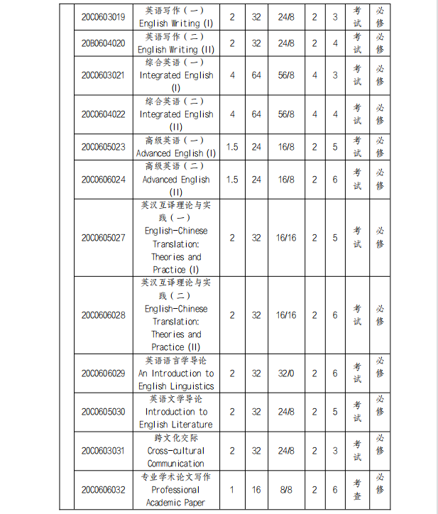 英语语法(一)(二)、英语听力(一)(二)(三)(四)、英语 阅读(一)(二)(三)(四)、英语写作(一)(二)、综合英语(一) (二)、高级英语(一)(二)、英汉互译理论与实践(一)(二)、英 语语言学导论、英语文学导论、跨文化交际