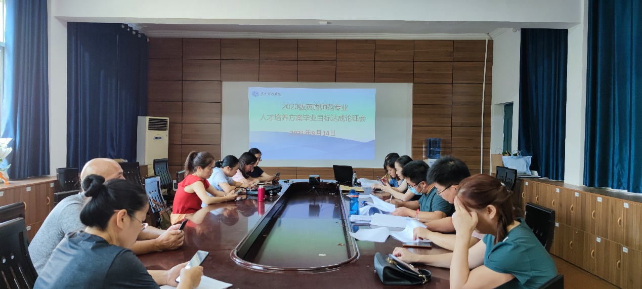 本网讯(通讯员 谭浩亮、翟晓丽)2021年9月14日下午15:30-17:30,外国语学院黄昊文副院长、英语系全体教师在博雅楼202教室就2020版英语(师范)专业人才培养方案中各课程对毕业要求的支撑度进行了研讨和修订。