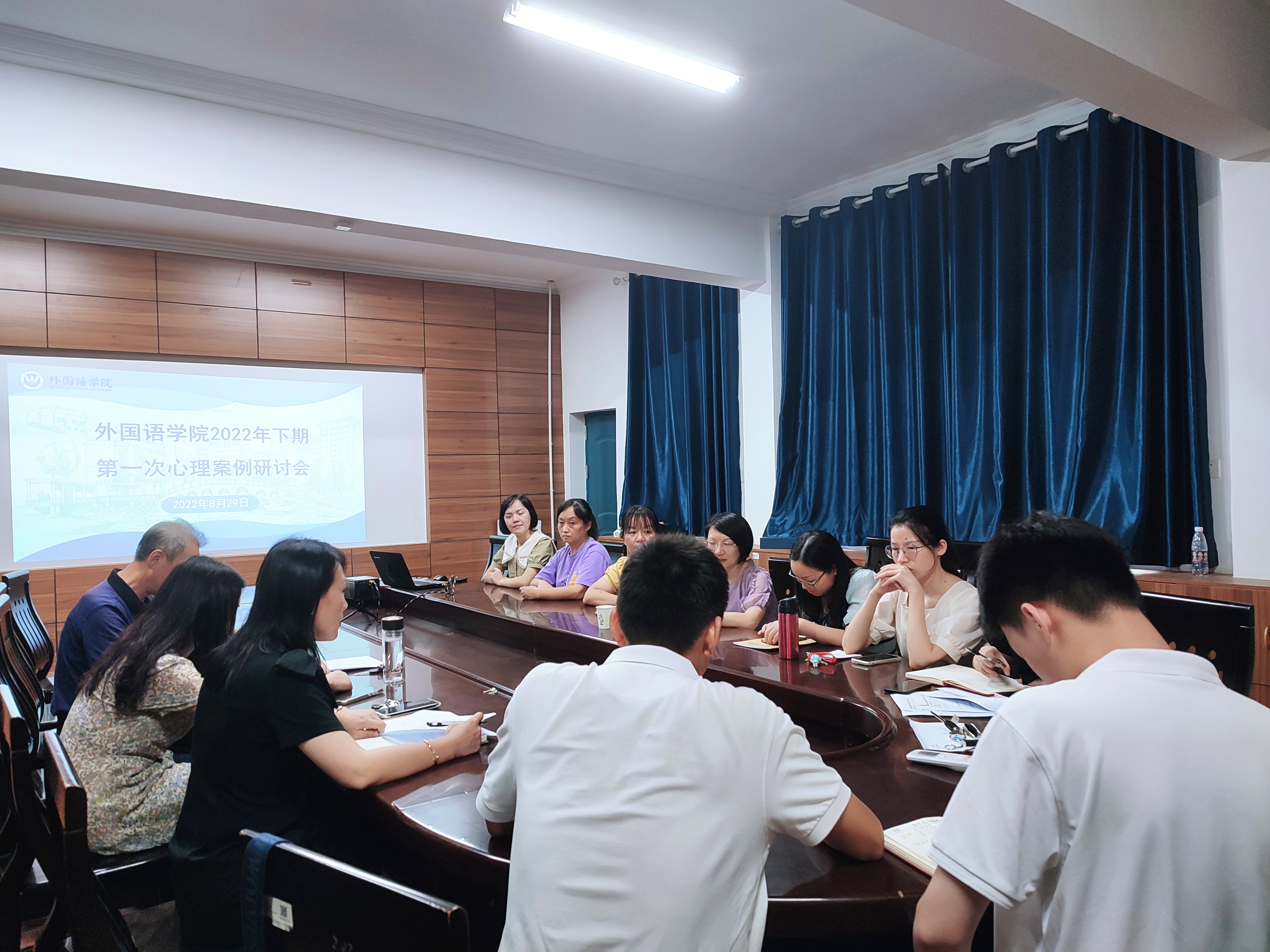 本网讯 为促进我院心理健康工作规范化、科学化发展,规范心理危机学生的预防、干预与管理工作,8月29日下午,外国语学院在博雅楼202会议室召开2022年下期第一次心理案例研讨会,外国语学院全体院领导、全体辅导员、各年级班主任共同与会,会议由党总支副书记、副院长罗晶主持。