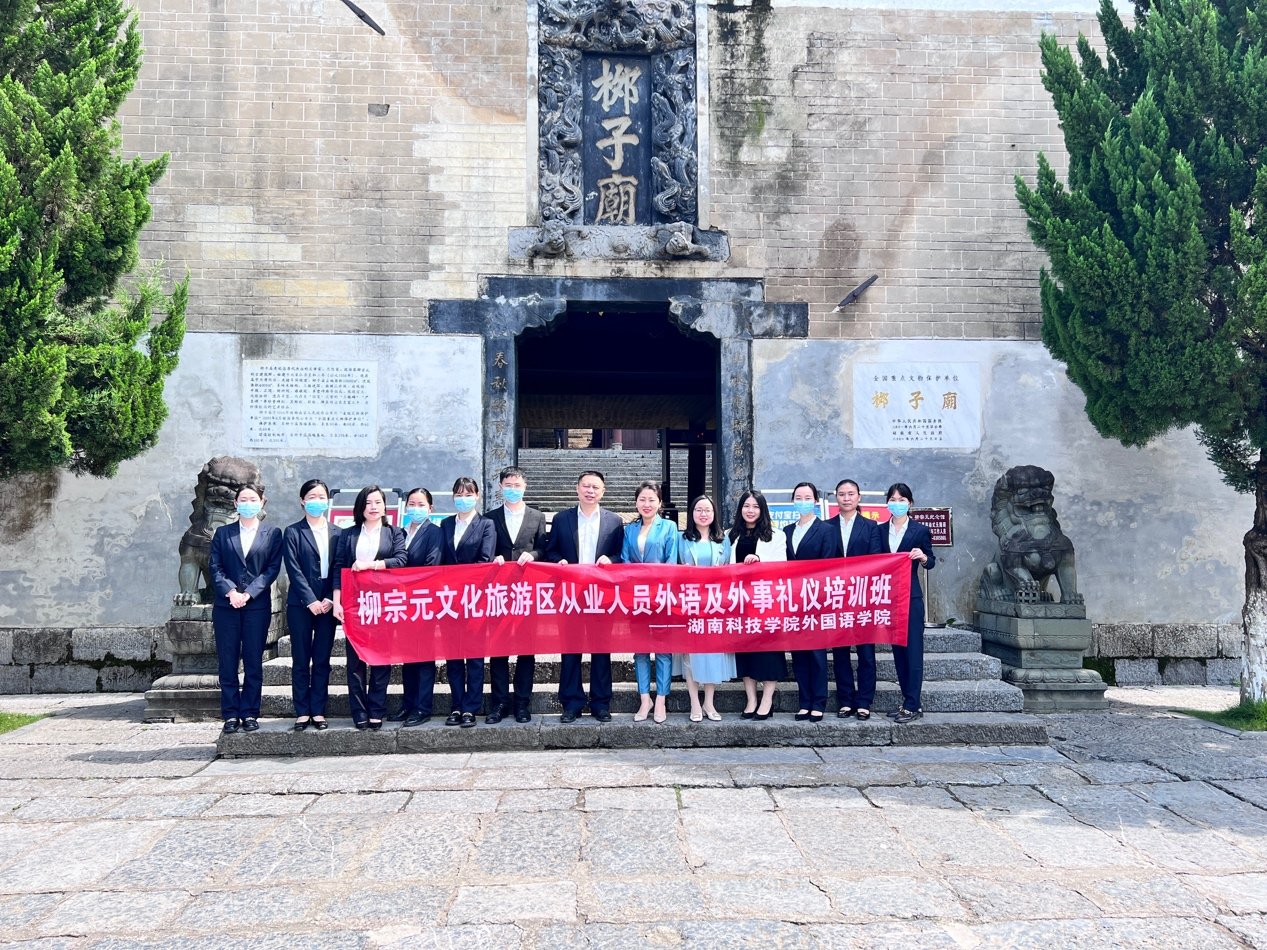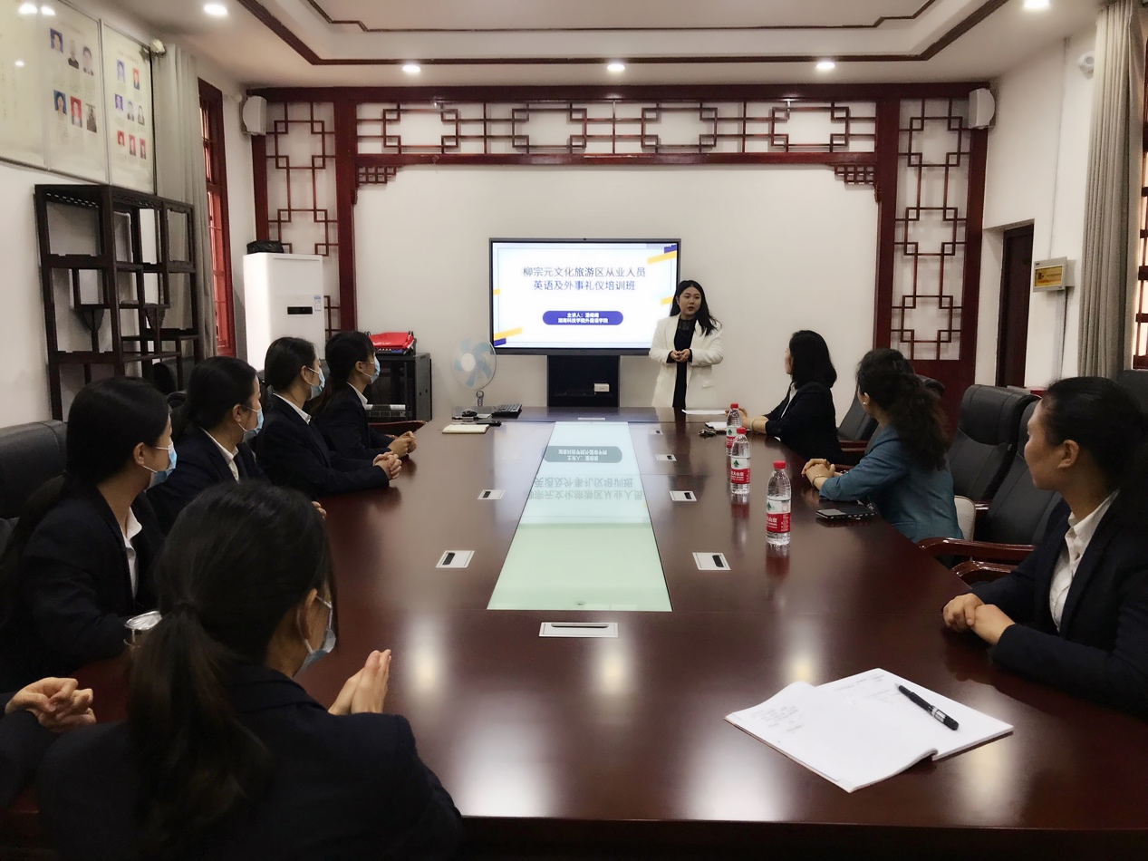 本网讯 连日来,外国语学院翻译团队多次深入柳宗元纪念馆对景区从业人员开展外语及外事礼仪培训。此次培训活动由学院副院长刘堃领队,翻译团队核心成员彭璐、潘缌缌两位老师应邀担任主讲人。