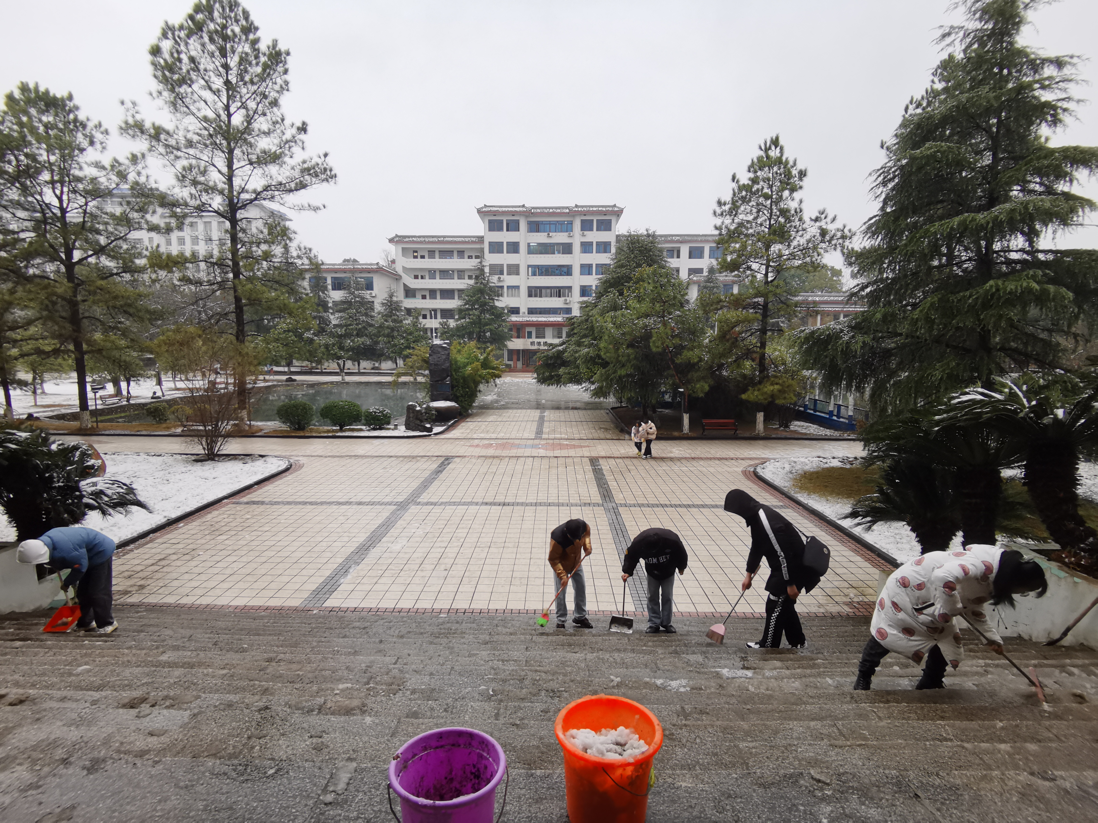 本网讯 2月22日,带着瑞雪兆丰年的气息,虎年的第一场大雪如约而至。在欣赏美丽的雪景之余,积雪也带来了安全隐患。为保障师生出行安全,2月23日7时,2021级辅导员刘罗老师带领志愿者开展了义务扫雪除冰活动,忙碌的身影筑成一道靓丽的风景线。
