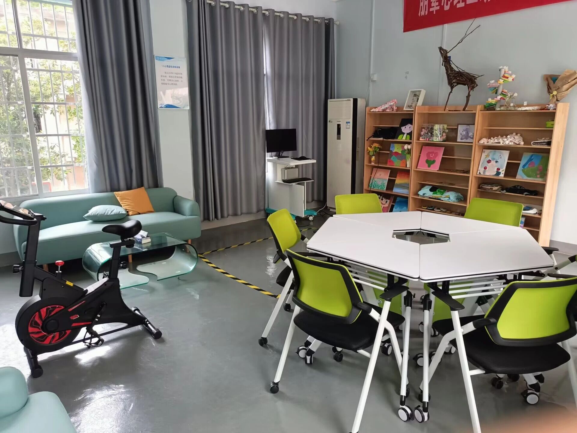 接待室内有休息椅,茶水和心理期刊。是日常接待来访学生、预约登记、填写相关材料、接听热线电话的心理第一站。