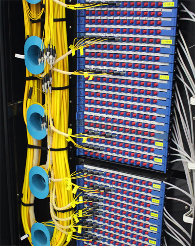 校内骨干光网采用两层结构设计,全校分8个区采用8个光交箱,互联8130芯光纤链路,主干线可覆盖校园内所有楼栋,实现了教学楼、办公楼48芯光纤进栋,学生宿舍、家属宿舍及其它楼栋24芯进栋,所有楼栋光纤通过光交接箱全部汇聚到交换中心,可实现任意楼栋间的纤芯跳接,可承载以太网、GPON、EPON等网络所需的链路结构,采用B1.3标准进行设计,提供1310nm、1550nm、1625nm三种波长的传输窗口,能满足今后光纤入户和逐步增加的校内各类数字化业务的建设需要,解决了百米外的局域网业务布线问题。