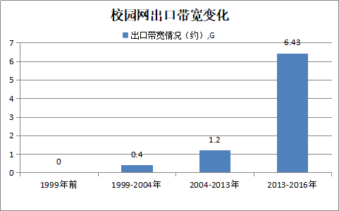 (4)出口带宽发展历程。当前总带宽已扩充至12G,由电信、联通、移动、教育网多个出口共同组成。
