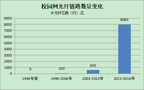 (1)光纤链路发展历程。第一阶段设备间采用双绞线互连,发展过程中部分楼栋新增了光纤进行互联;第二阶段骨干网采用了光纤链路进行数据通信;第三阶段采用结构化布线思想对校内光纤链路进行了重新设计,两级光纤芯数已达8000芯。前期,伟德光主干缆数已经基本完成全覆盖,十年内无需再铺设主干光缆。2016年至今新增加了3个接入机房,共增加二级光缆130芯,共计约8130芯。