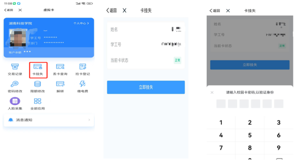 4.点击‘卡挂失’,可以对校园卡进行挂失操作,进入后点击‘立即挂失’,确定后需要输入校园卡密码,默认密码为:身份证后六位,X01代替,如您申领了校园卡,使用中校园卡丢失,请及时进行挂失;