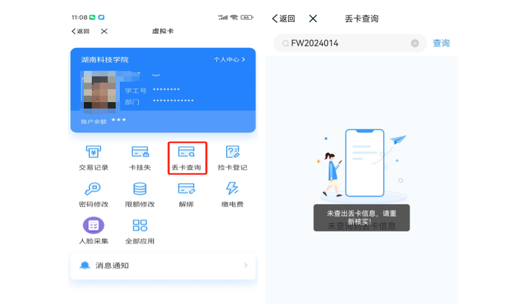 6.点击‘丢卡查询’,可以查询到别人进行登记的捡卡信息,您可以与其取得联系,沟通获取卡片,如需帮别人代查,请在上方搜索框内输入要查询的学号;