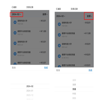 3.点击‘交易记录’,可以按月查看到充值消费流水记录,点击左上角年月位置,可选择月份查看,点击全部位置,可以选择要查看的记录类型;