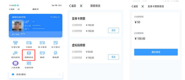 7.点击‘限额修改’,可以对您的校园卡限额进行修改,点击修改后,输入需要的额度,点击确定修改即可完成。为避免您的资金受到损失,可以结合自己的消费习惯,修改合适的金额。