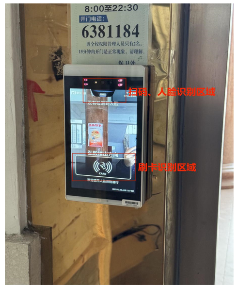 1.刷卡识别方式:出示校园卡贴合门禁终端刷卡区域。因系统升级,持实体卡用户,需要到食堂或超市任意一台消费机进行一次刷卡消费激活卡片后才能进行门禁刷卡识别使用,开学后,新发卡用户可以直接使用。