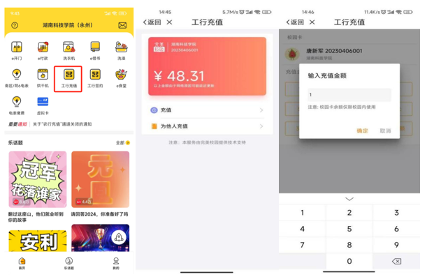 2.   点击“工行充值”,选择或输入充值金额,选择“工行充值渠道”,点击确认支付即可对校园卡进行充值;