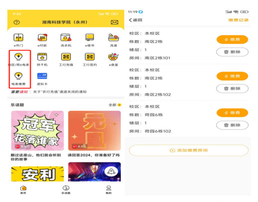 南区、荷园6栋点击南区/荷6电表,其它宿舍区域点击电表缴费,相应区域选择对应需缴费房间进行电表缴费。