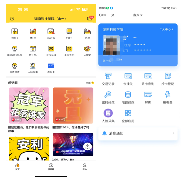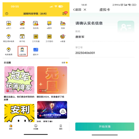 3.人脸识别方式:如您需要使用人脸识别,请在“智校乐”app内,点击“人脸采集”服务,点击“开始采集”上传自己的证件照或者拍照上传,上传完成后需要5分钟左右照片进行下发。如您之前已上传过照片,不能进行人脸识别,请您重新上传。