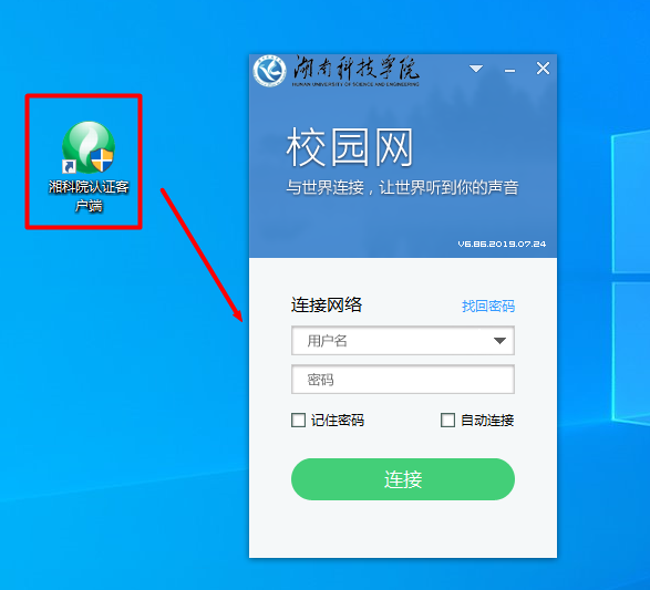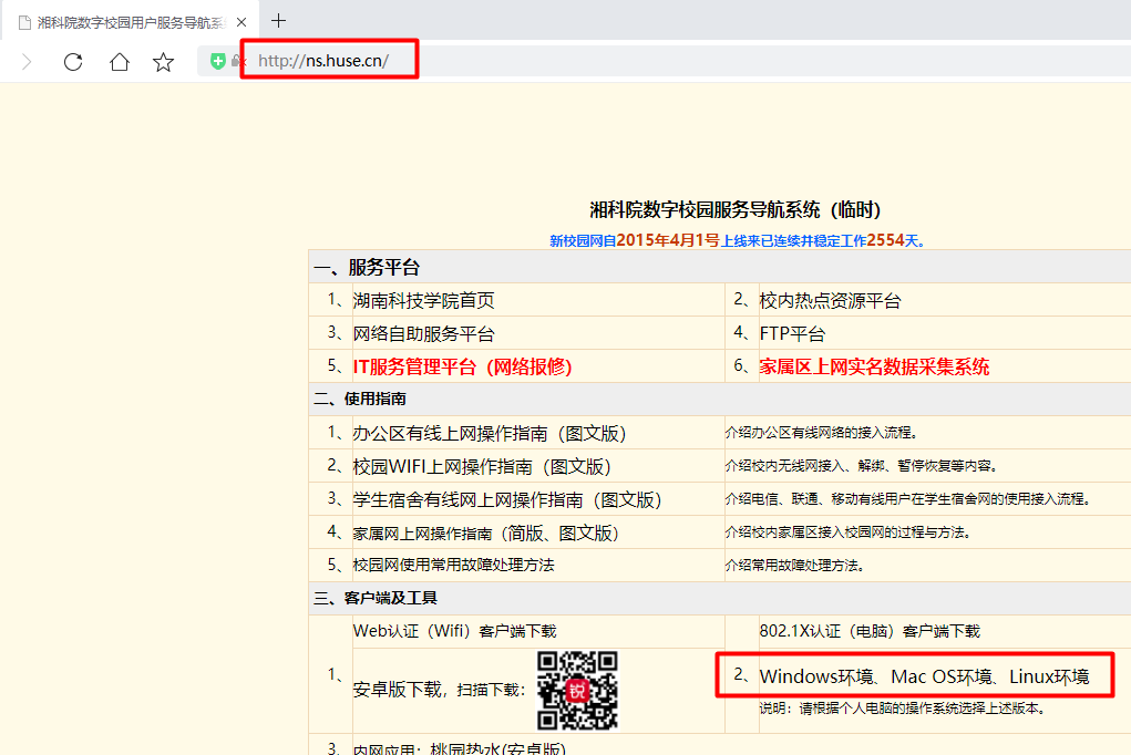 (1)用户连接网线后自动获得校园网 IP 地址,运行任意浏览器,在网址界面 输入网址ns.huse.cn 进入校园内网将弹出下图页面,在“客户端工具”中根据电脑操作系统环境点击下载相应环境的客户端。