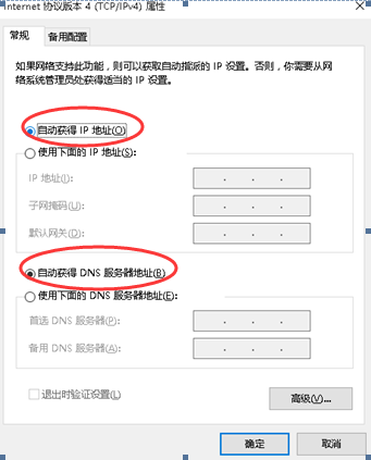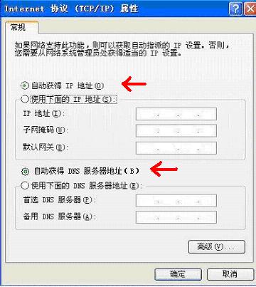 (5)选择【自动获得IP地址】及【自动获得DNS服务器地址】。设置完成后点击【确定】退出。