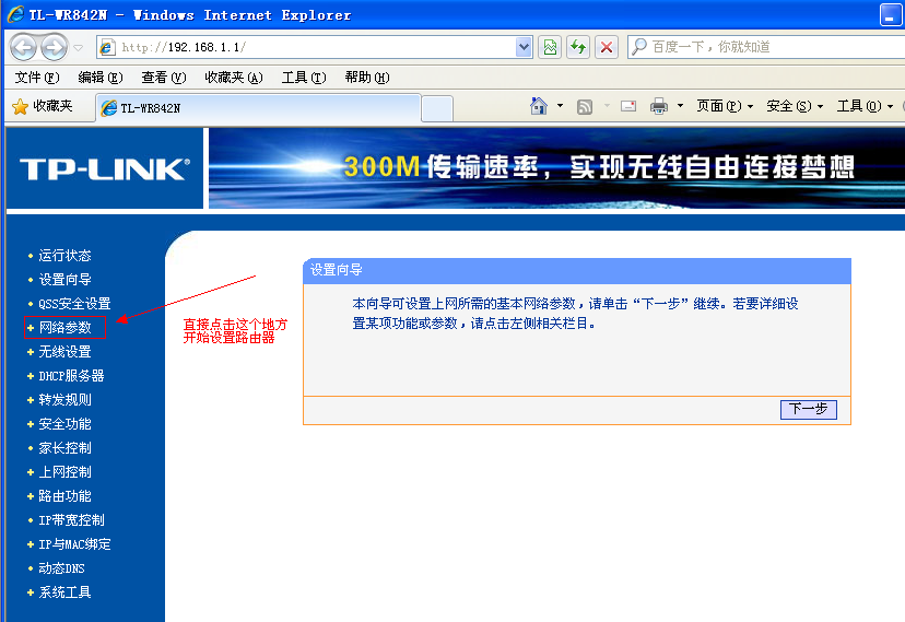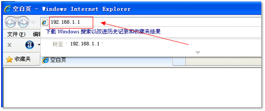 Internet Explorer 浏览器,如图在浏览器地址栏输入路由器默认局域网ip地址:192.168.1.1 ,回车:
