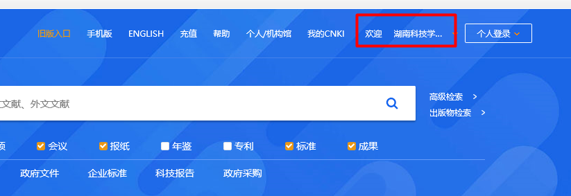 出现欢迎 湖南科技学…,即登录成功。您可以尽情的使用知网各类资源。