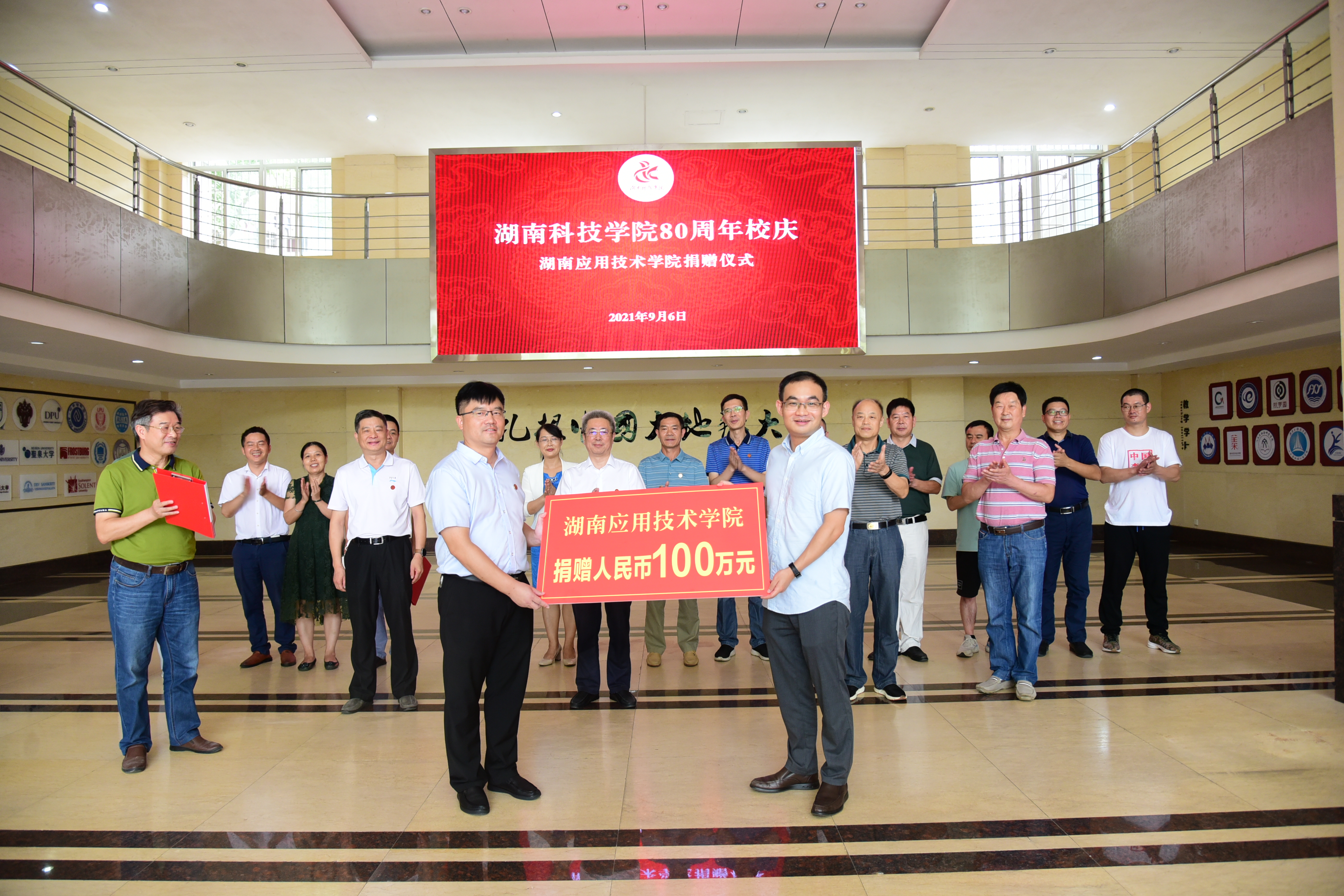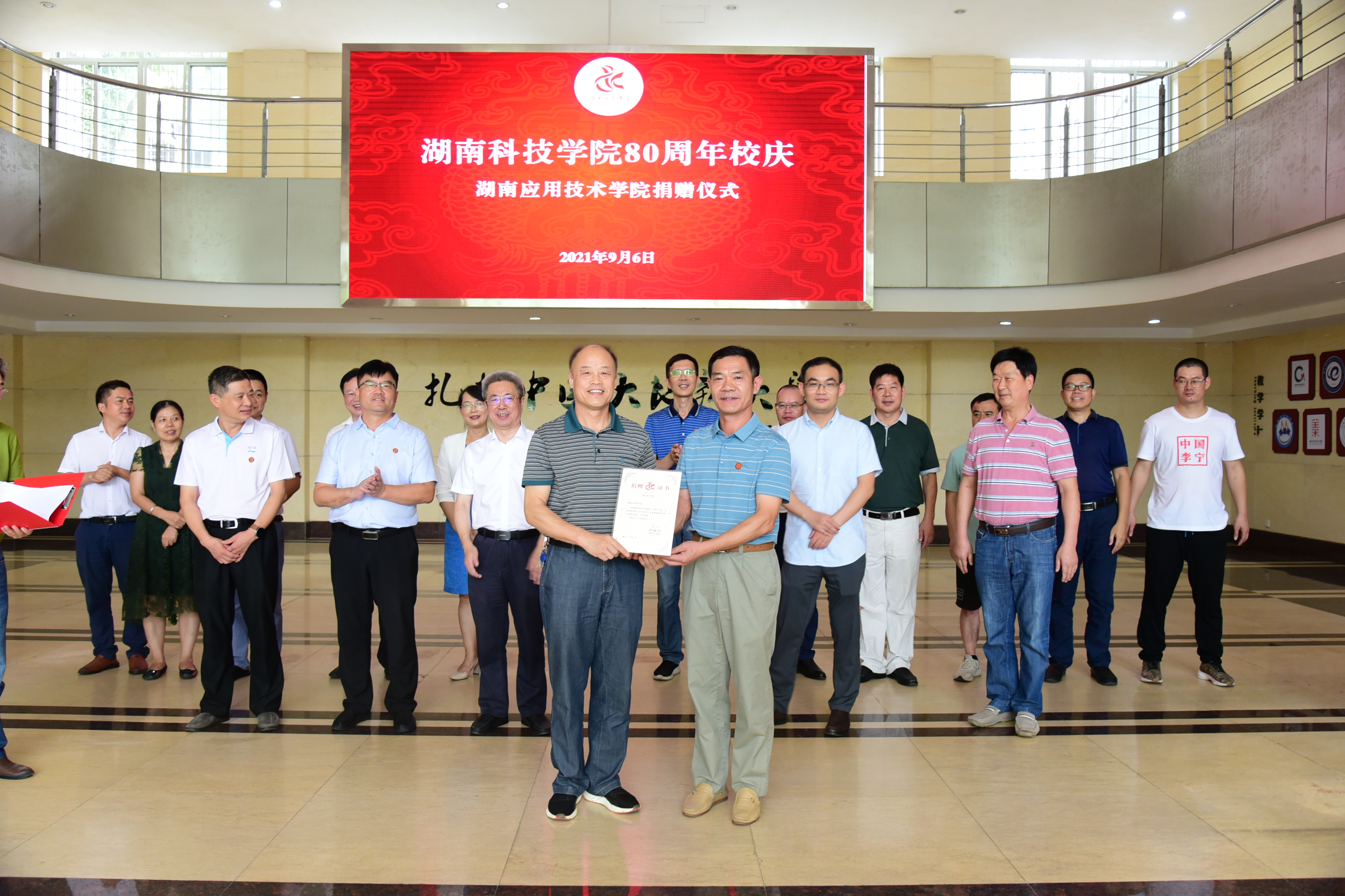 党委副书记、校长李钢代表学校接受湖南应用技术学院捐赠,党委委员、副校长、教育基金会会长吴小林为捐赠者颁发捐赠证书。