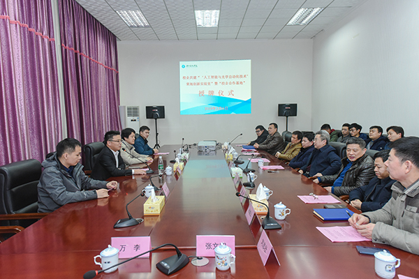 曾宝成与李海荣共同为“校企合作基地”授牌,唐艳明与李海荣共同为“‘人工智能与光学自动化技术’荣旭创新实验室”暨“校企合作基地”授牌,现场响起热烈的掌声。