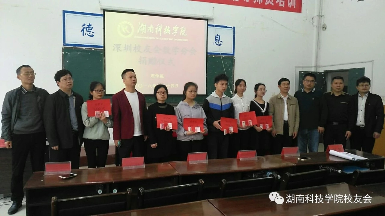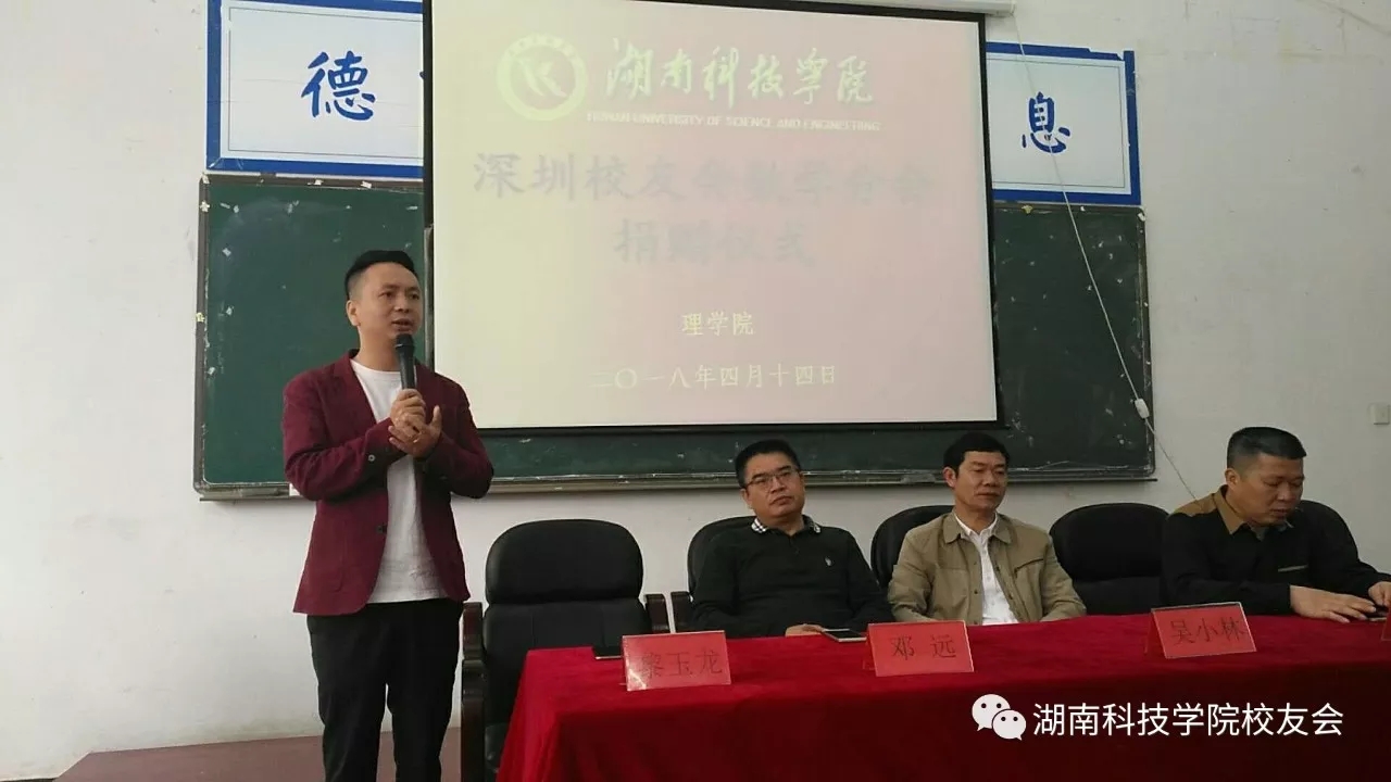 4月14日,由深圳校友会数学系分会发起的资助优秀贫困生捐赠仪式在理学院举行。副校长、教育基金会理事长吴小林;校友办主任张恒俊;理学院相关领导;深圳校友会数学系分会会长邓远以及校友代表黎玉龙、胡盛出席了本次捐赠仪式。