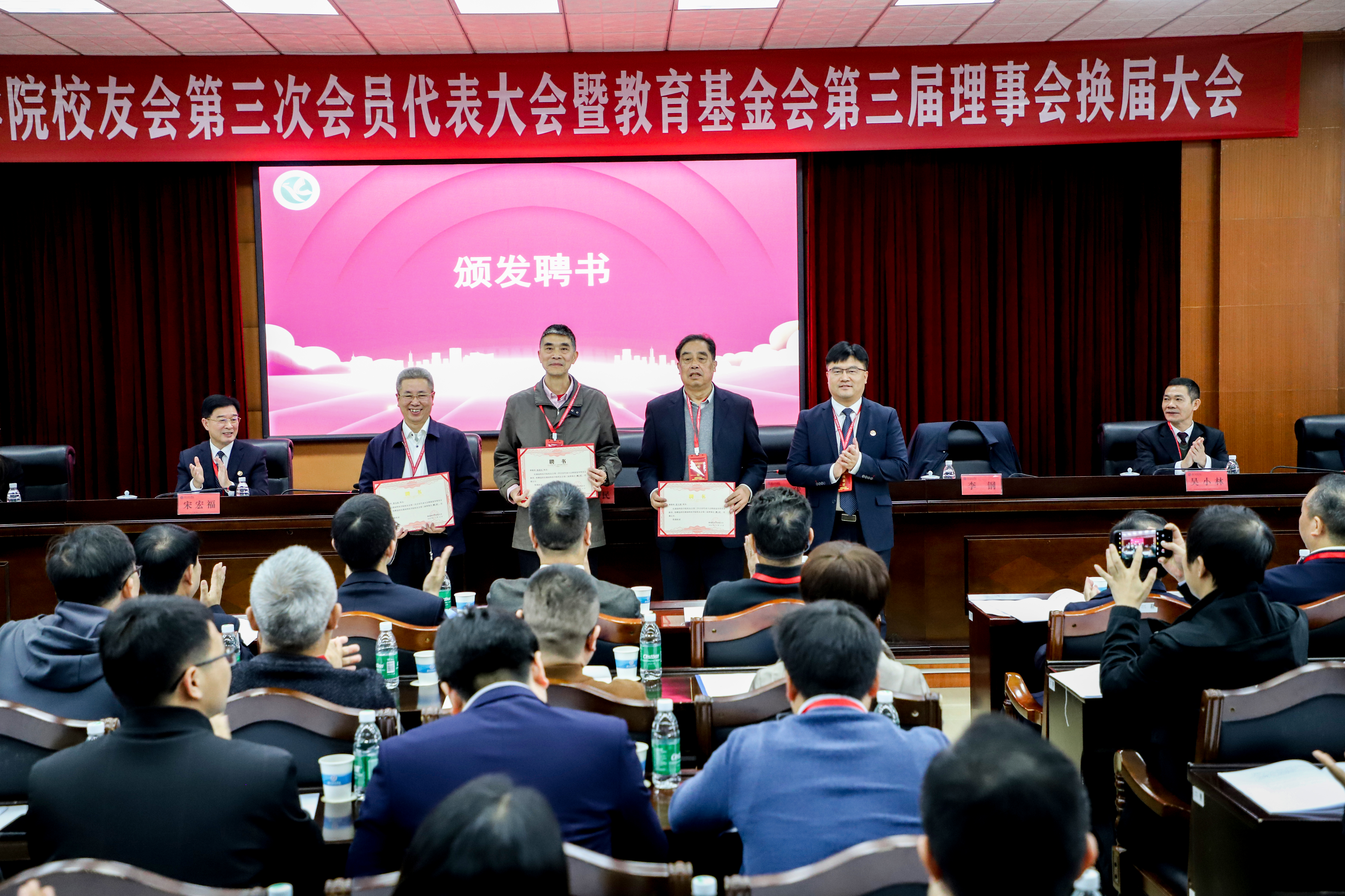 李钢为陈建民、管天球、曾宝成三位领导颁发顾问聘书。陈建民、管天球、曾宝成以及校领导为校友会第三届理事会、教育基金会第三届理事会负责人颁发聘书。