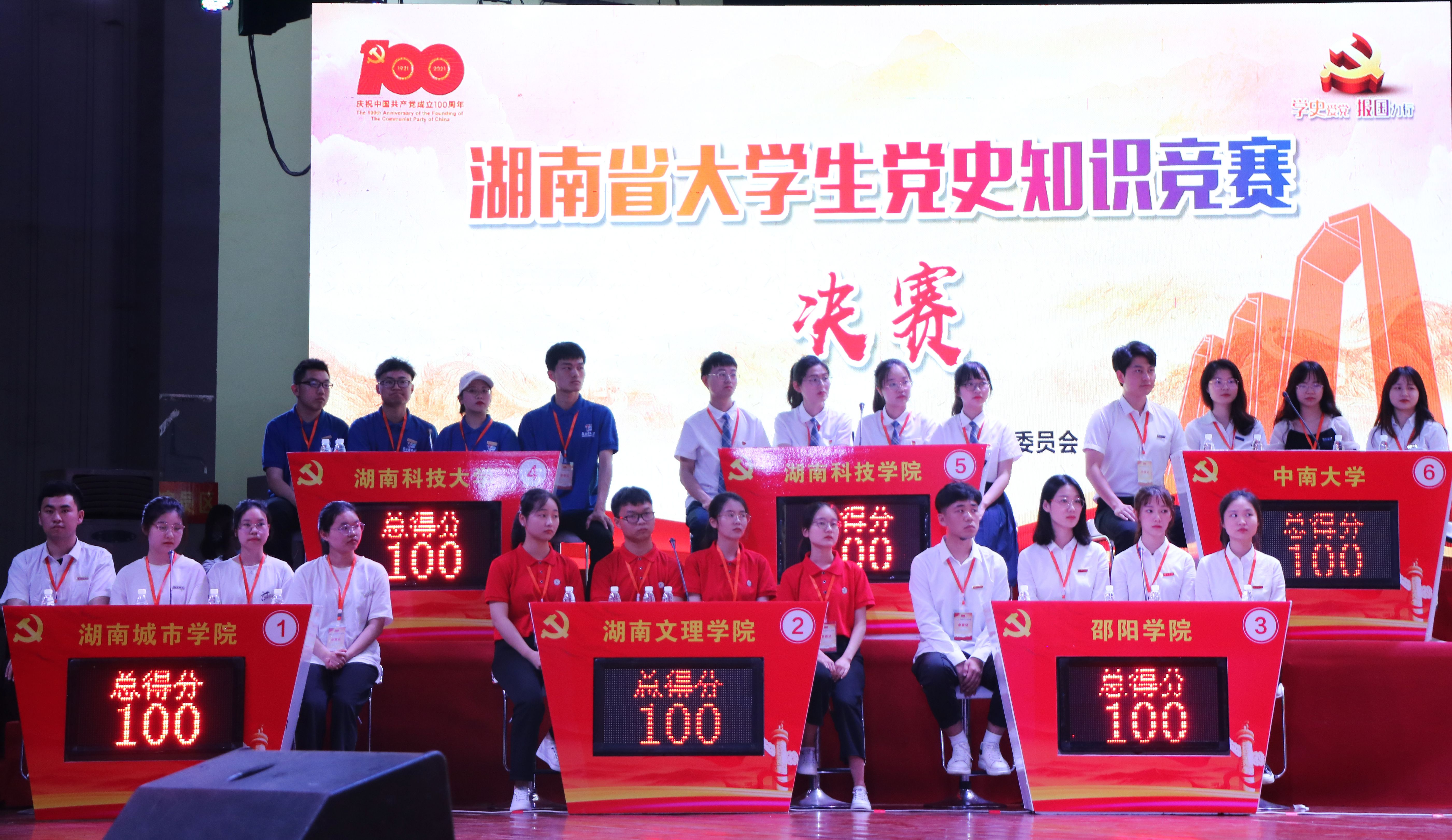 湖南省大学生党史知识竞赛分为初赛、复赛和决赛三个阶段,以学校为单位参赛,自3月下旬开赛以来,全省100余所高校组织队伍参赛,累计30多万人次参与,12支高校队伍进入决赛。决赛采取积分累计赛模式,采用多元化的赛制,共设三轮答题,分为“有问必答” 必答题、“狭路相逢”对战题、“勇攀高峰”挑战题三个环节。选题范围涵盖党章、党的十九大报告、习近平《论中国共产党历史》、毛泽东诗词、《毛泽东选集》等内容。