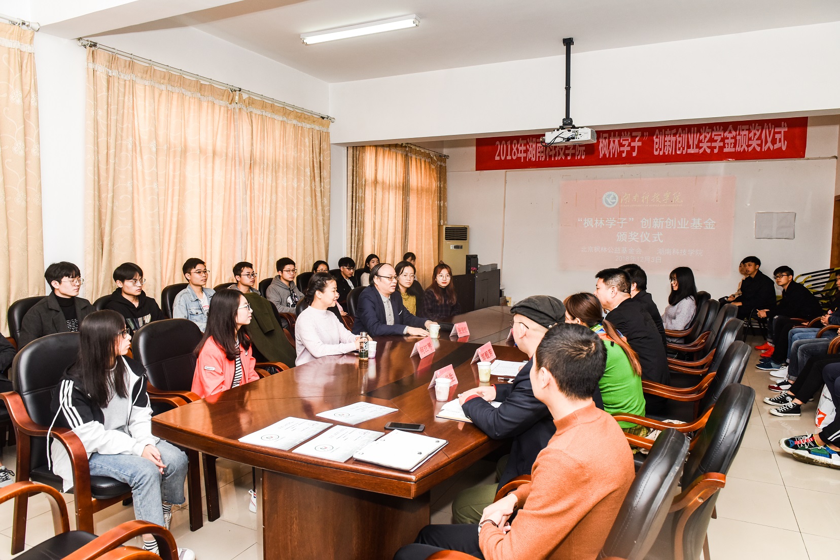 12月3日下午,学校举行首届“枫林学子”创新创业奖学金颁奖仪式。副校长程智开, 77级校友、北京校友会会长、北京枫林公益基金会理事长张亚红,北京枫林公益基金会秘书长何江琴共同为44个获奖项目颁奖。
