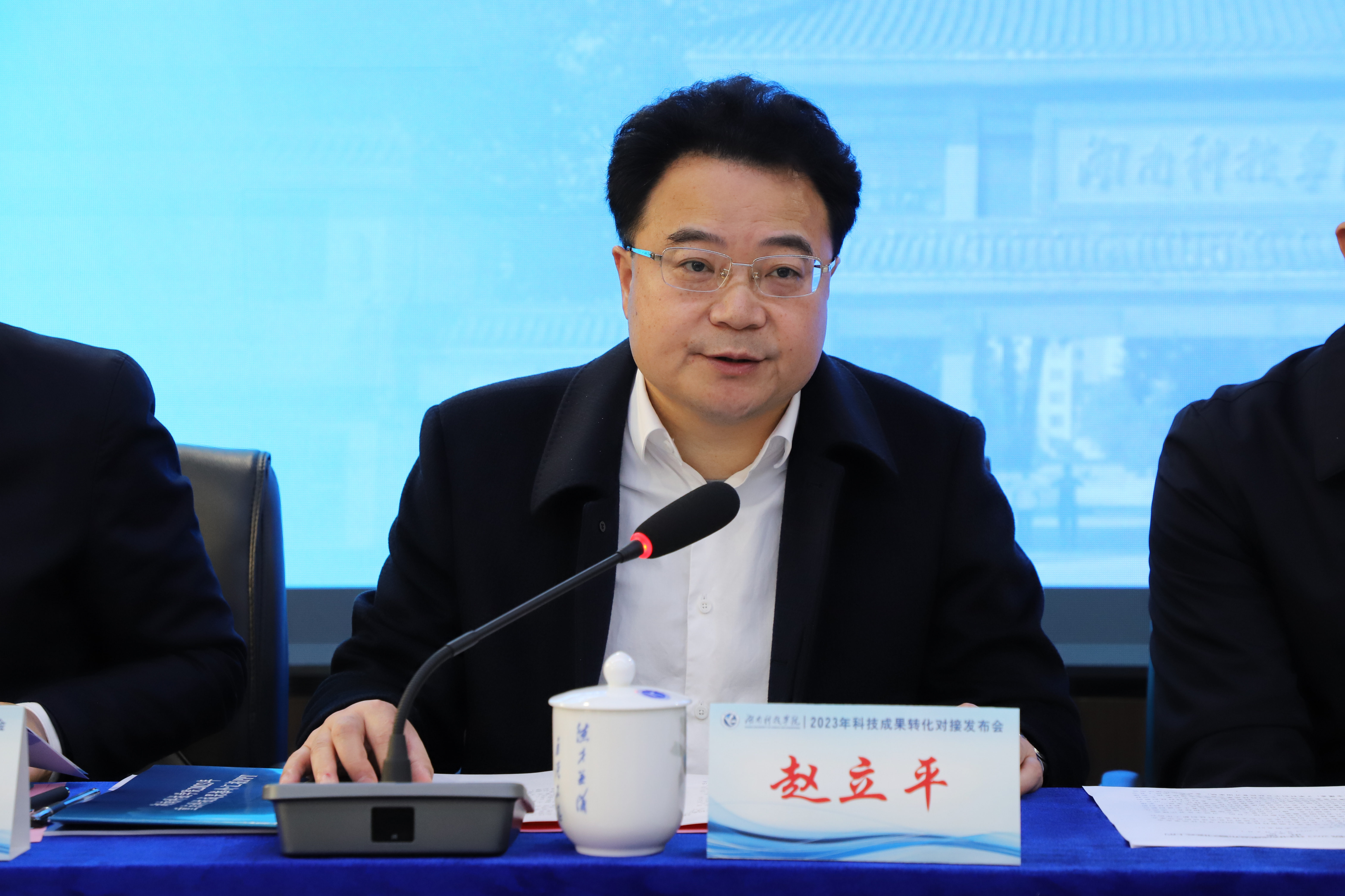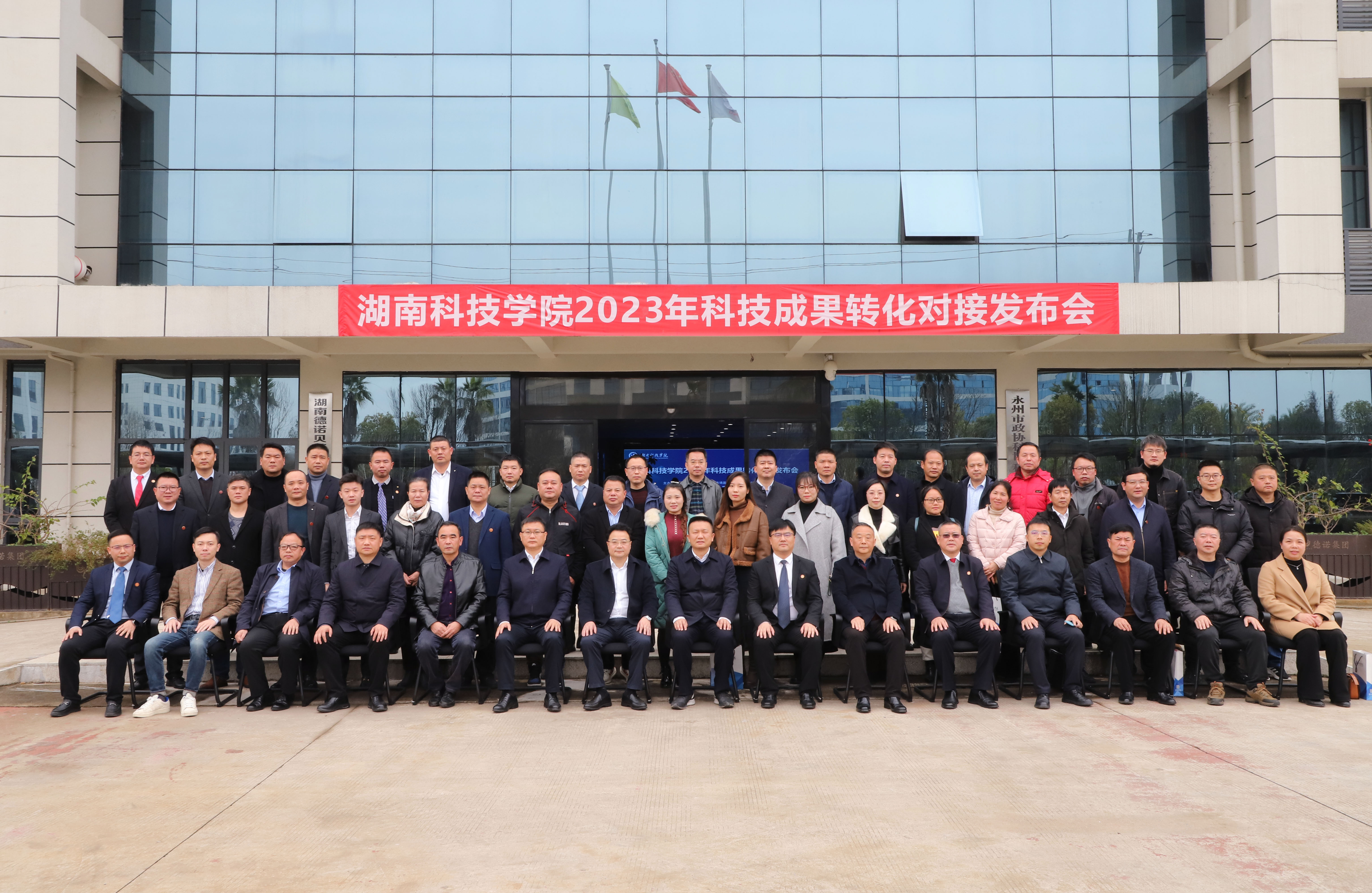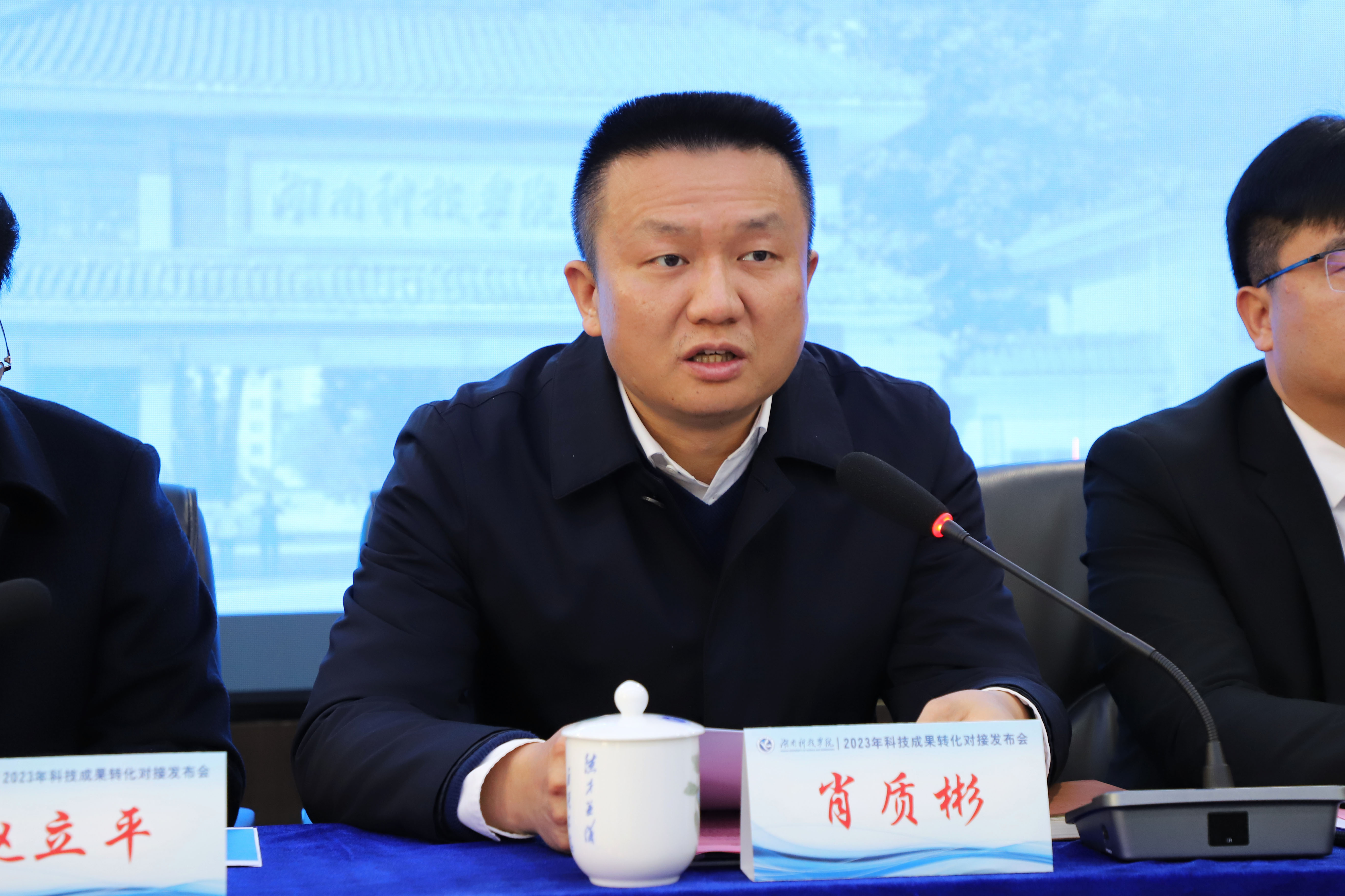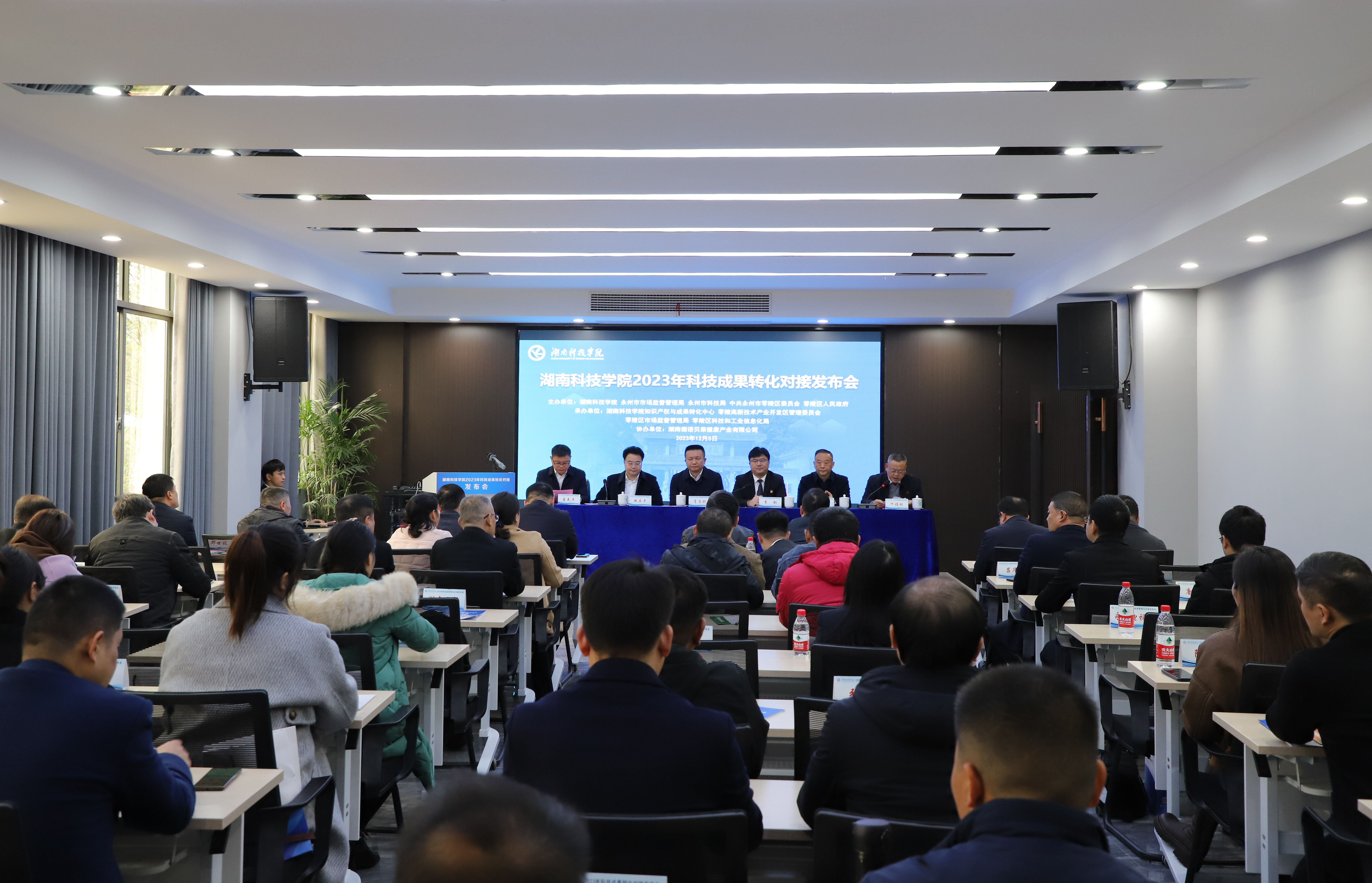 本网讯 12月5日上午,学校2023年科技成果转化对接发布会在零陵高新技术产业开发区举行。永州市人民政府副市长肖质彬,中共零陵区委书记赵立平,党委书记李钢,党委委员、副校长何福林,永州市市场监督管理局党组书记艾克海,永州市科技局党组书记、局长易先平参加。