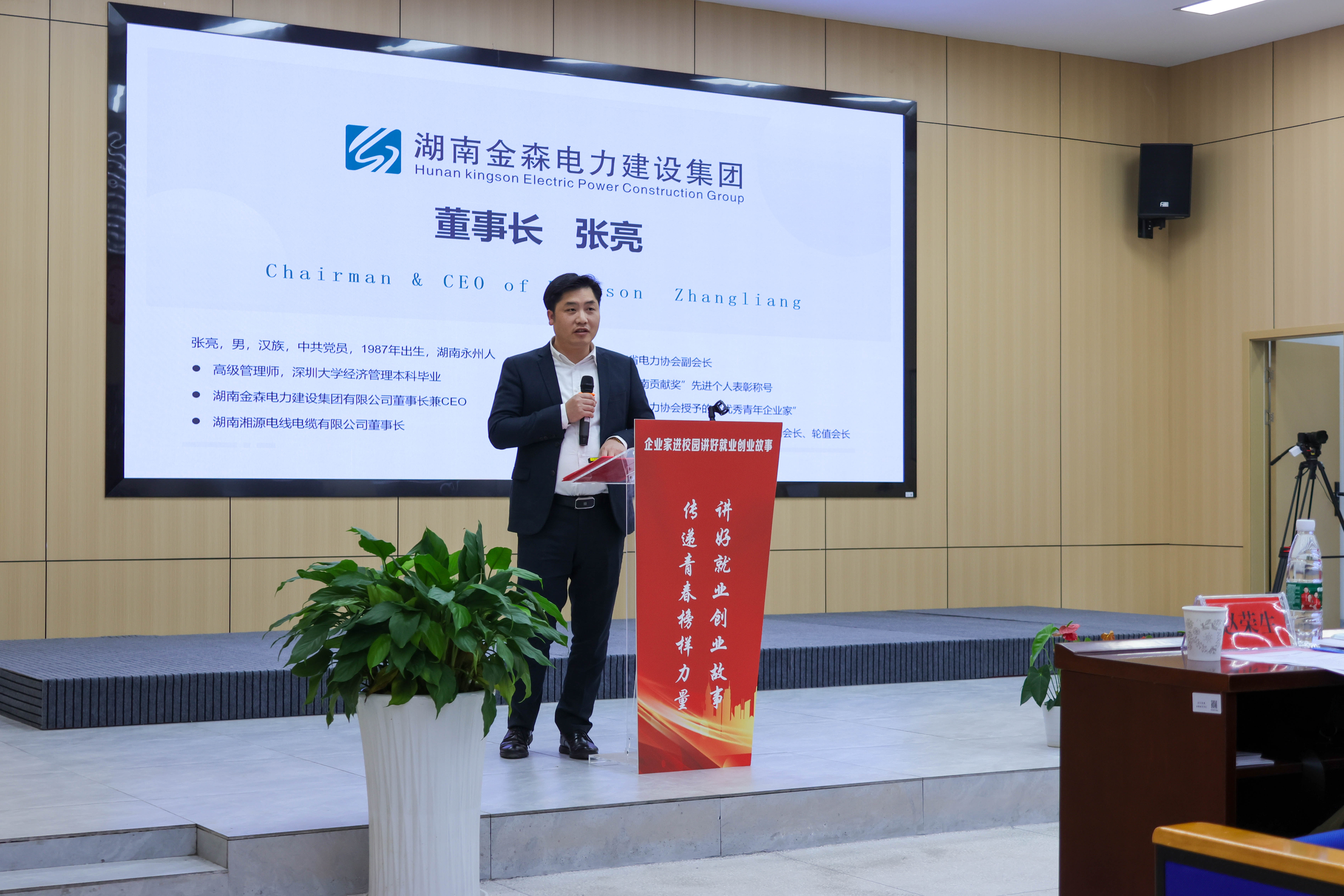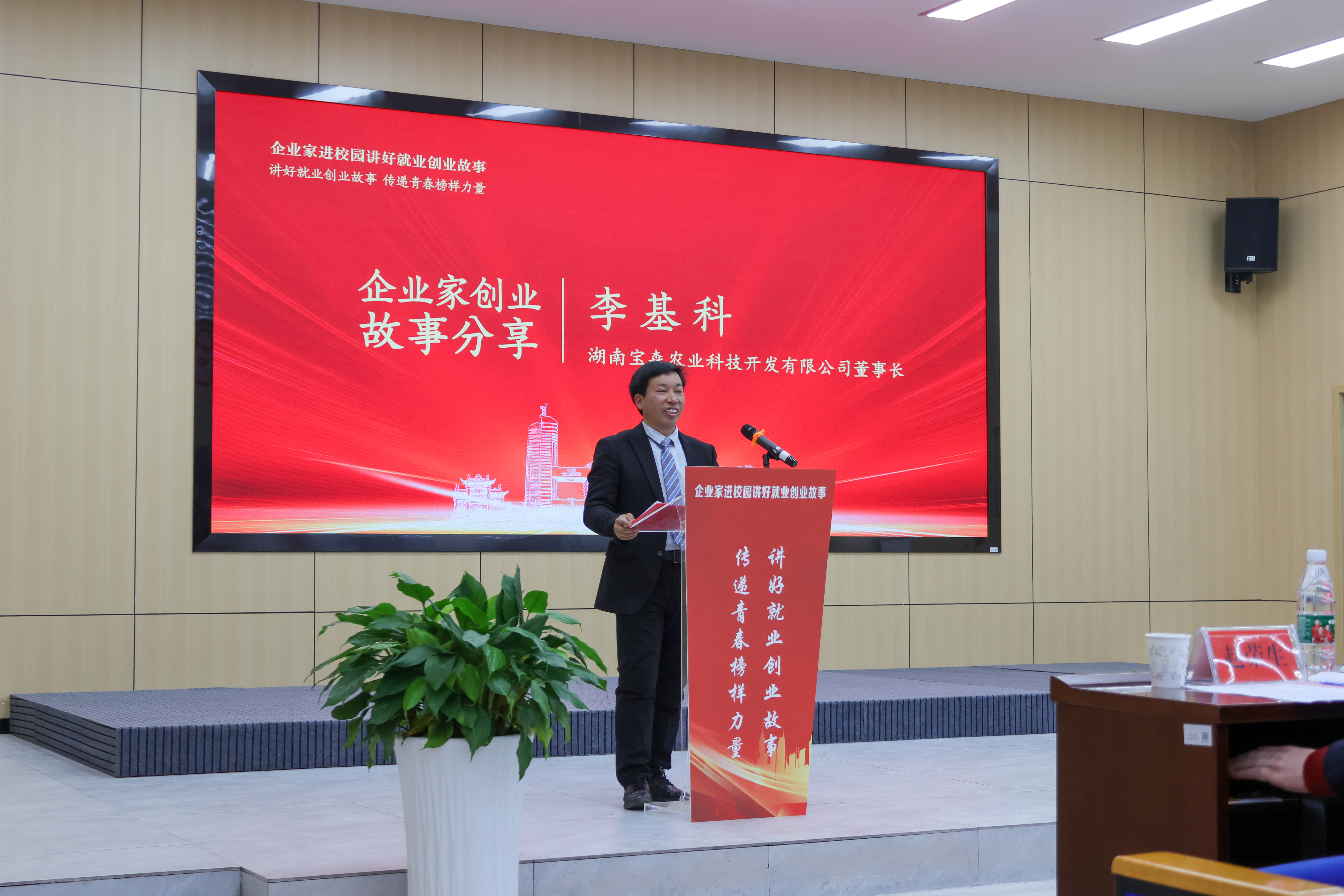 湖南省财信产业基金管理有限公司投资经理李彦廷以《以金融活水助力百万师生创新创业》为题,介绍财信金融控股集团有限公司的相关知识与情况,并讲解创新创业服务的相关信息。湖南金森电力建设集团董事长兼CEO张亮结合自己的创业经历,对择业、就业、创业进行了详细的分析,鼓励同学们勇敢就业,积极就业,体现人生价值。原中文系2003届校友、湖南宝森农业开发有限公司董事长李基科分享了他的创业经历,希望同学们扎根于乡村,回馈家乡。