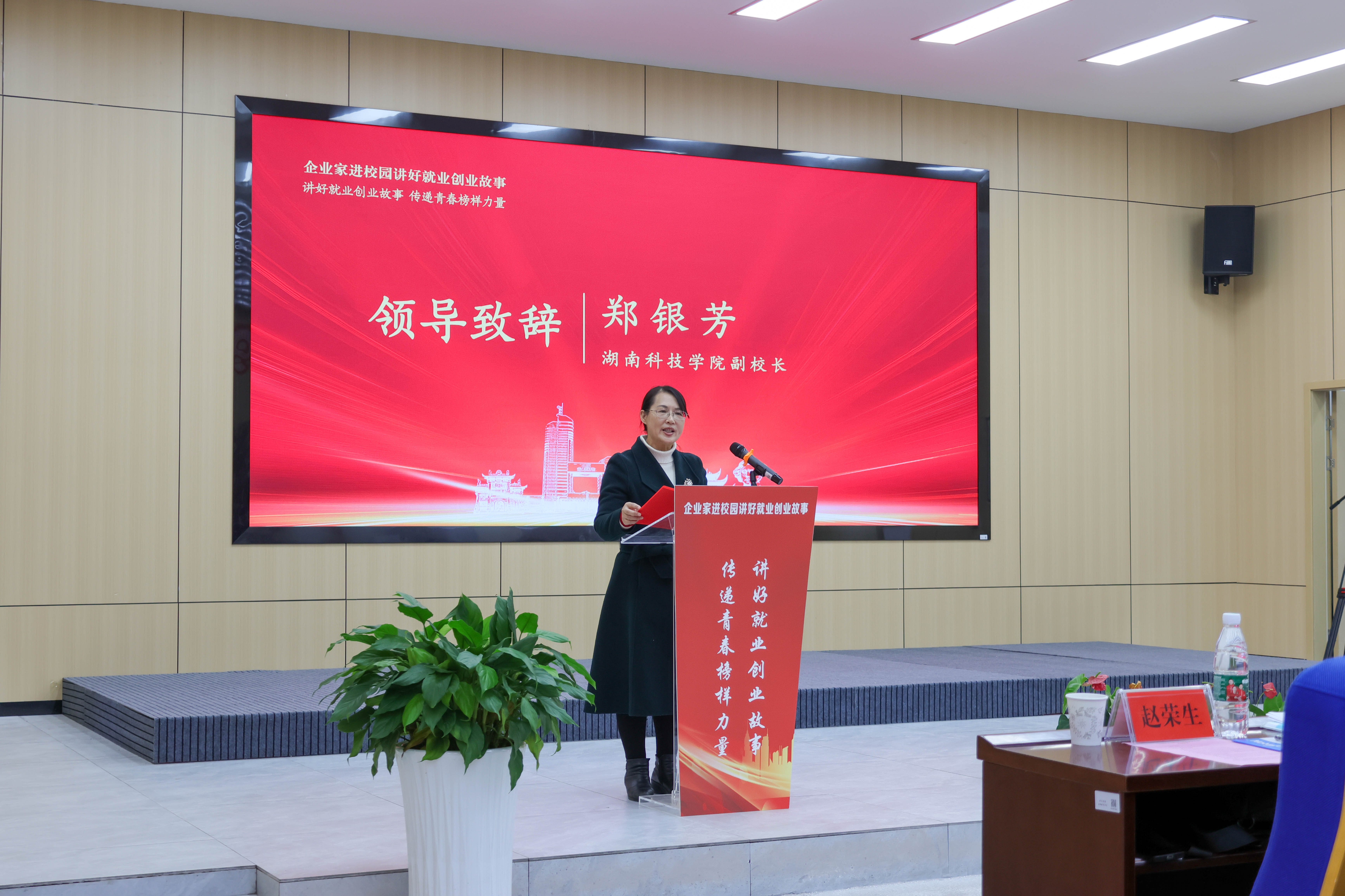 郑银芳代表学校对莅临本次活动的来宾表示热烈的欢迎和衷心的感谢,并简要介绍了伟德师生创新创业取得的优秀成果。她对青年学子提出了三点希望,一是正视就业环境,积极主动就业。要将社会需求与个人成长紧密结合起来,客观定位,理性决策,提升就业竞争力,消除就业迷茫和就业焦虑;二是投身创新创业,不负青春。要深刻感受理解企业家精神和创新思维,投身创新创业实践,用青春书写华彩篇章。三常怀感恩之心,追求永不止步,希望同学们始终保持着一颗赤子之心,秉承德才兼备,自强不息的精神,朝着梦想的方向努力前行。