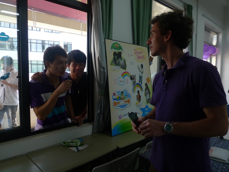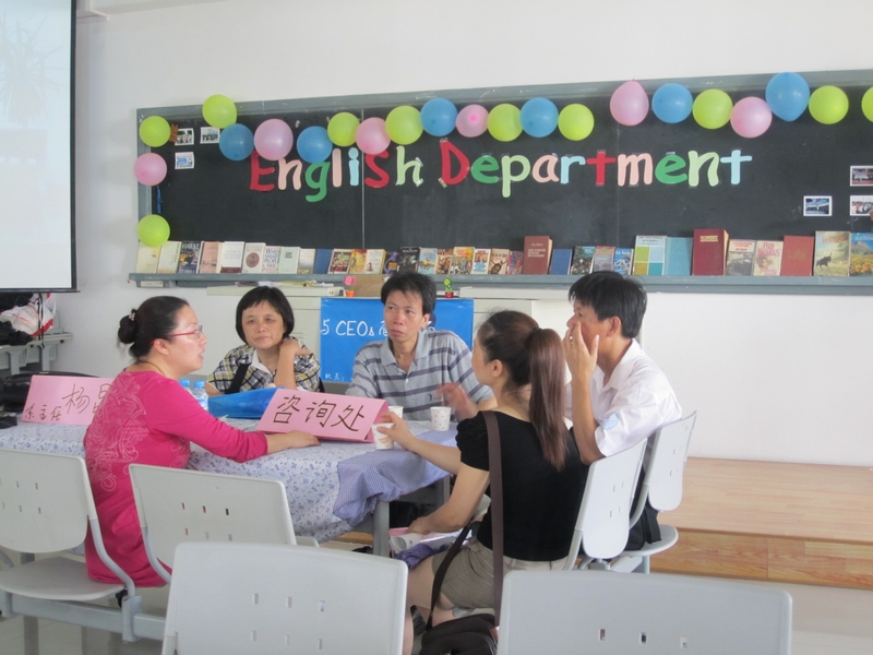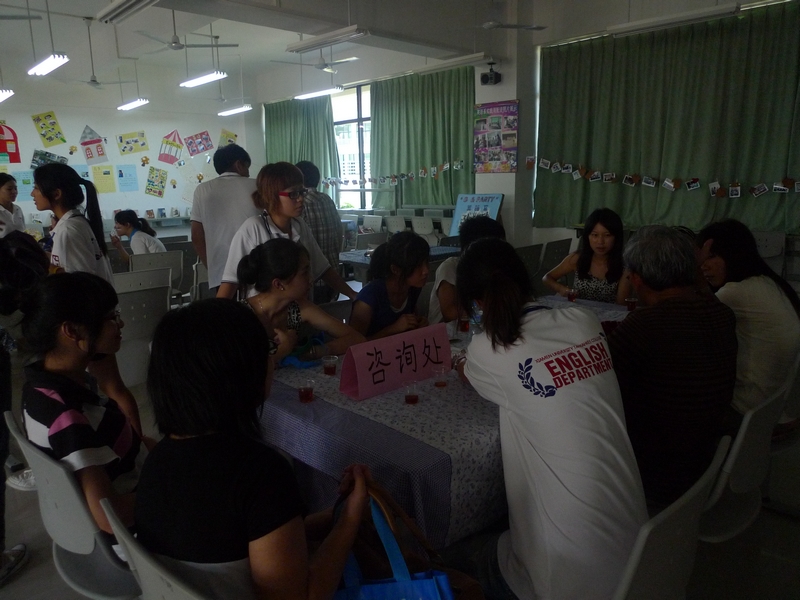 为了让远道而来的家长更好的了解英语系的信息,英语系特设了上午、下午两场英语话剧演出和师生互动环节,邀请来了英语系主任杨昆老师、外教Stephen Ling与Michael特到现场助阵,并为新生与新生家长一一解答。英语系的学子则站在门口热情的迎接学生和家长,为学生与家长提供可乐、花茶、橙汁等饮料,积极为各个来访的学生与家长介绍英语系的师资、特色以及学生活动等信息。更有角色扮演的同学纷纷被要求合影留念,不仅赚足眼球,更为英语系的宣传推波助澜。