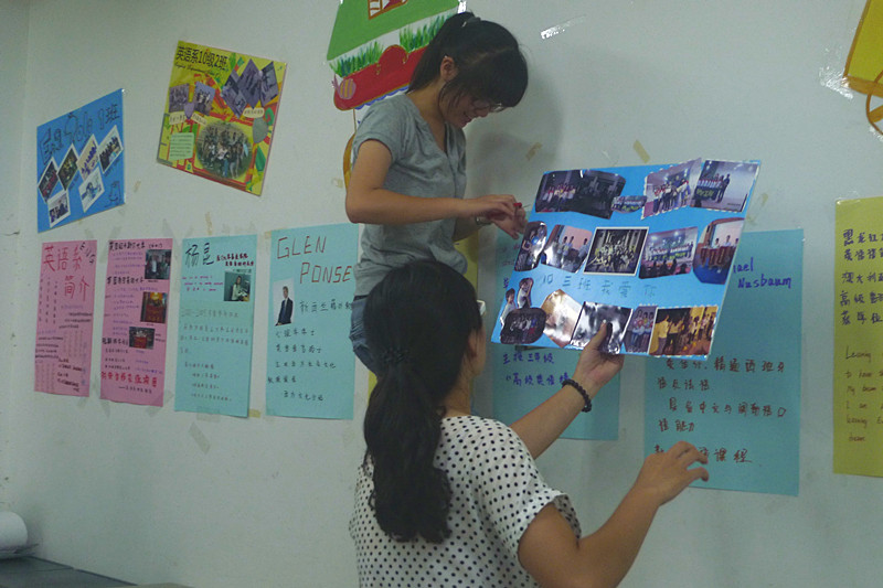 古堡主题的英语系开放日在经管楼304进行。各种颜色的气球悬挂在黑板四周,中间的“English Department”显得格外醒目。窗户两侧内外缀满同学们曾经的笑脸,图片似乎也荡漾着银铃般的笑声。后墙的海报则展示了英语系的优秀师资,以及老师和部分已经毕业的优秀学长学姐的寄语。英语系成长的足迹遍布了整个教室,融合着我们的努力,为这一片天空划下一道亮丽的风景线。