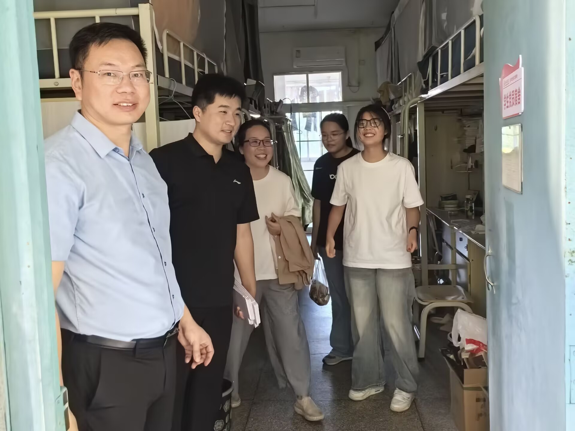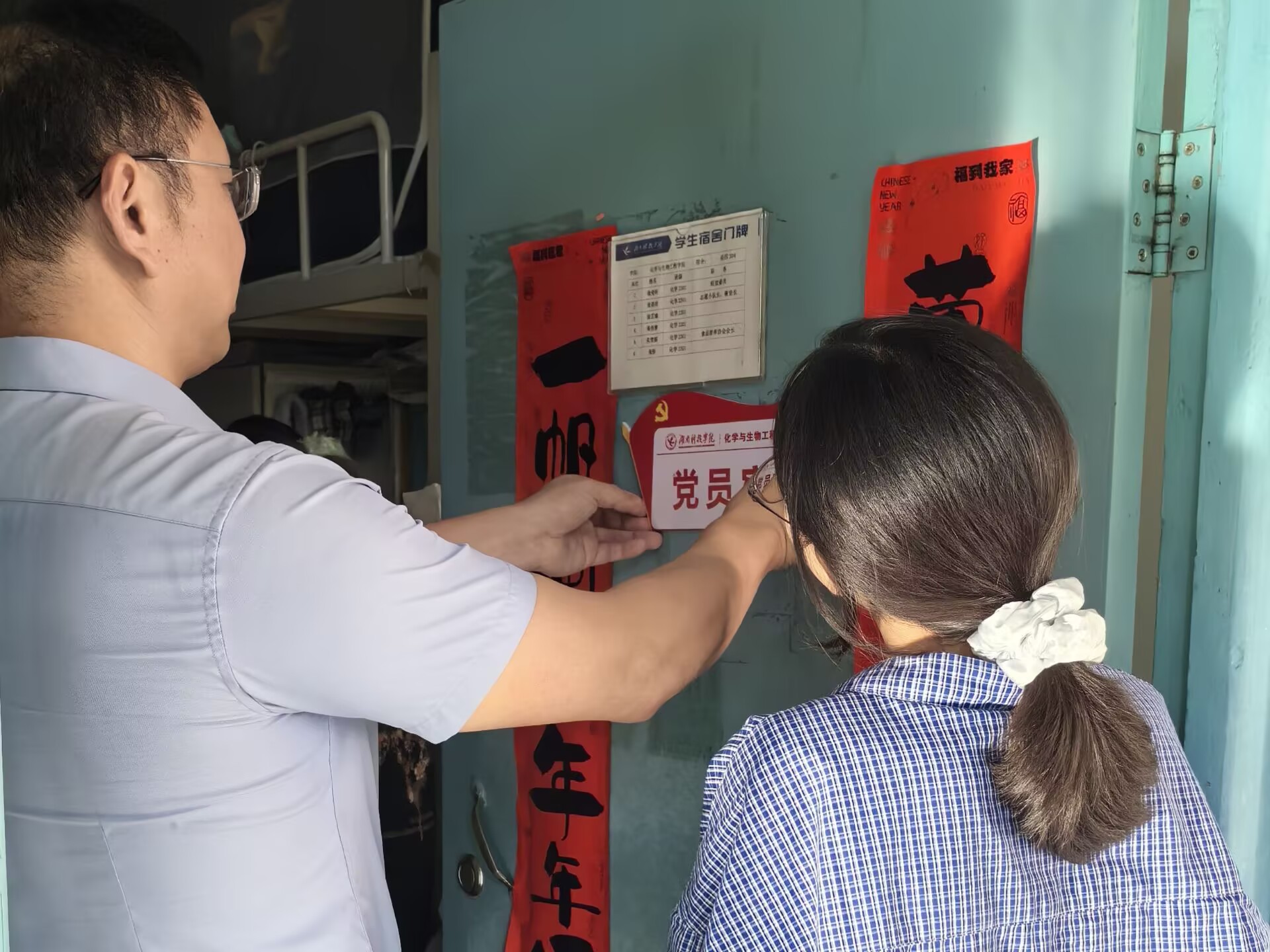 每到一处,刘国华书记都详细询问学生党员的学习备考进度、寝室生活状况,并亲手将党员宿舍门牌粘贴在寝室门上。他叮嘱大家要以门牌为“责任牌”,及时反映同学们的心声和需求,做好师生沟通的“桥梁”纽带,发挥党员同志先锋模范作用。