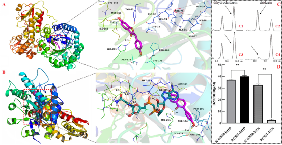 (S)-雌马酚是大豆苷元经特定肠道菌代谢所产的一种植物雌激素,在维持动物和人体健康方面发挥着重要作用。研究表明,(S)-雌马酚具有防治心血管相关疾病、缓解绝经妇女更年期综合症和预防雌激素相关癌症等作用。由于只有部分个体能通过肠道菌合成(S)-雌马酚,利用产(S)-雌马酚基因进行体外量产是满足广泛需求的最佳选择之一,但目前产(S)-雌马酚基因资源相对匮乏,严重制约了(S)-雌马酚量产和应用。该研究从鸡肠道中分离到一株产(S)-雌马酚梭菌ZJ6,通过生物信息学分析、基因体外克隆表达和功能验证、酶活性位点定点突变以及宏基因组分析等方式,发现和鉴定了一个新的具有双向酶活性特征的大豆苷元还原酶基因K-07020。根据K-07020构建的产(S)-雌马酚基因工程大肠杆菌可用于(S)-雌马酚的体外生产工艺研究。另一方面,宏基因组分析显示K-07020和相关(S)-雌马酚菌可能广泛存在于人和动物的肠道中,并影响个体的产(S)-雌马酚能力,这对于个体产(S)-雌马酚差异和(S)-雌马酚的生成调控机制研究提供了重要参考。