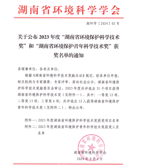 (本网讯 李尊华 刘乐)近日,湖南省环境科学学会对在我省生态环境相关领域的科学技术、科技成果转化、新技术引进与推广等方面做出突出贡献的个人和组织进行了表彰。我院生物化工学科博士团队联合湖南科森农业股份有限公司完成了《农业废弃物资源化利用与环境污染综合治理的“五位一体”生态循环系统》项目研究,该项目凭借其突出的创新性和实用性,在众多项目中脱颖而出,获湖南省环境保护科学技术二等奖。