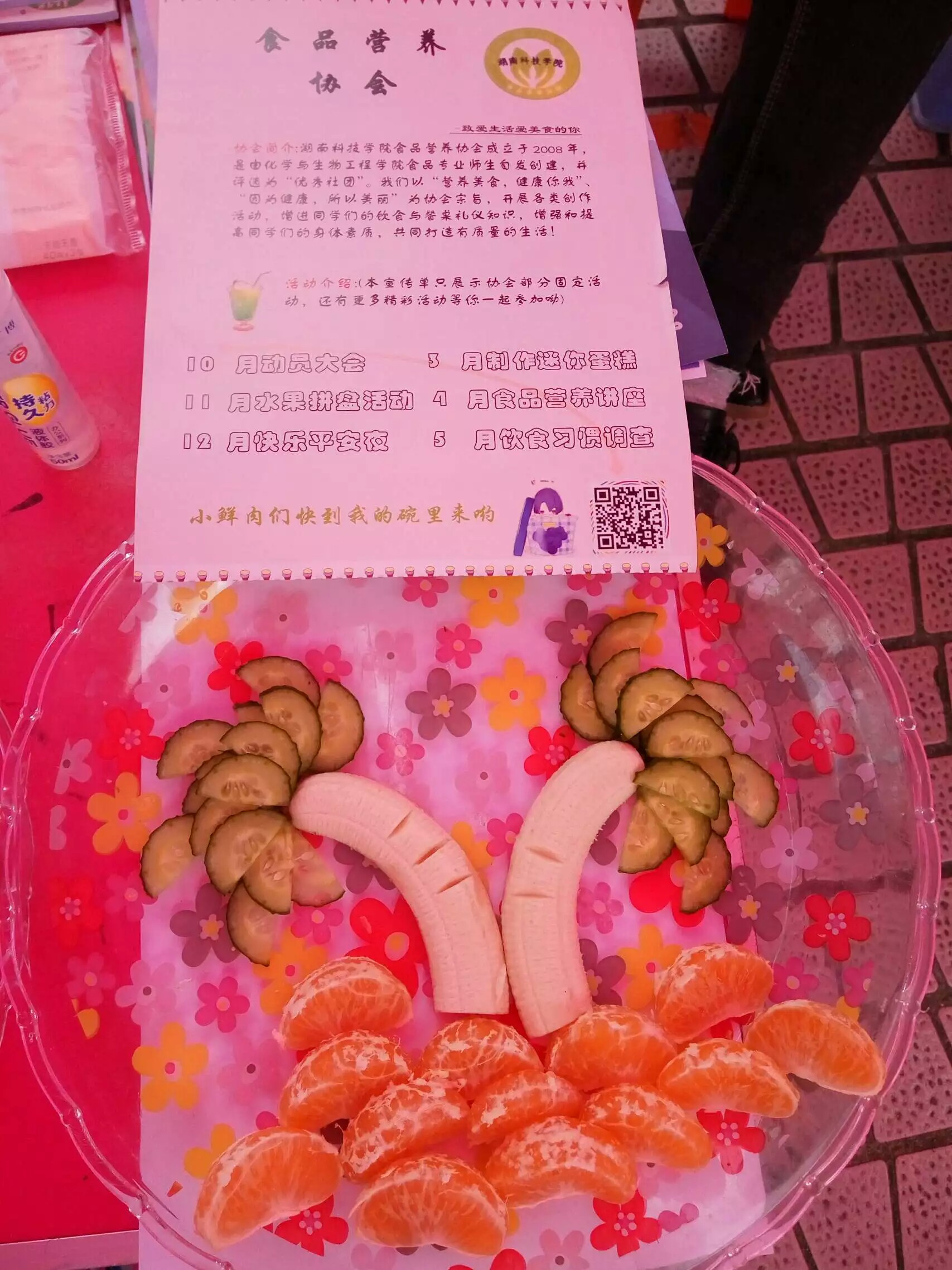 很多大一的新生在15号一大早就来到了文化广场,各社团争奇斗艳,场面气氛热闹非凡。化生院五大社团招新方式也可谓别出心裁,通过微信网络平台、布置宣传海报、发宣传单等方式不遗于力地招兵买马。食品营养协会制作了水果拼盘,绿色潇湘环保协会展出了环保作品,让新生们充分了解每个社团的创办理念、工作内容以及其特色。