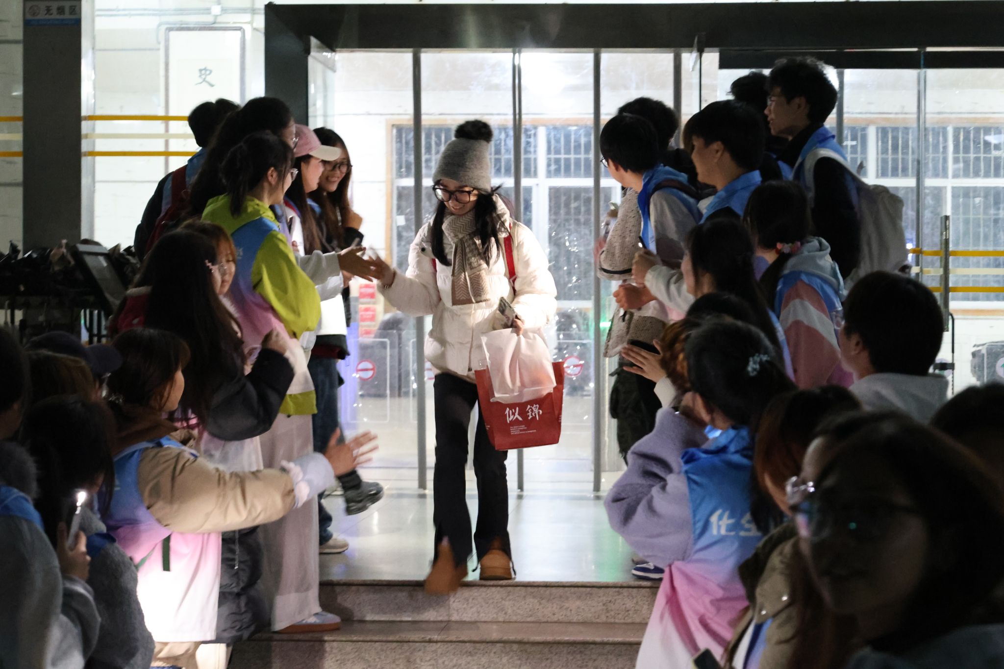 在考研学子步出自习室前,加油团已准备就绪。当学子们陆续走出图书馆时,团学代表们挥动手中的荧光棒,齐声送上诚挚祝福:“学长学姐辛苦了,考研加油!”除此之外,团学代表们分列两侧,伸出双手与每一位经过的考研学子击掌互动。击掌声不仅传递了温暖与力量,更展现了我院师生团结一心的精神风貌。