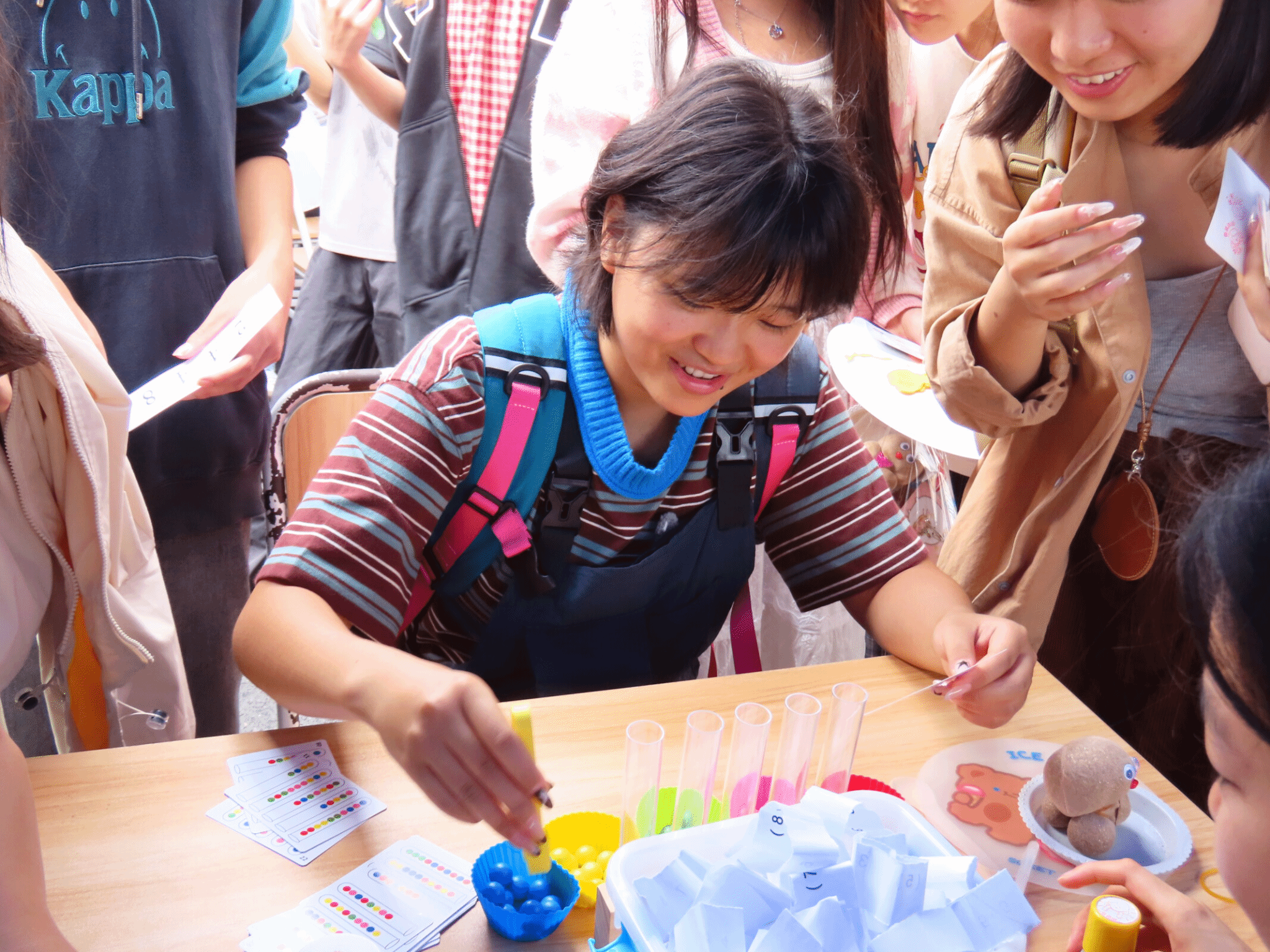 活动设置“正话反说”“动作猜词”“神奇24点”“色彩顺序挑战”四个趣味环节,同学们通关即可获得钥匙扣、明信片等实用奖品,现场气氛热烈,欢声笑语不断。