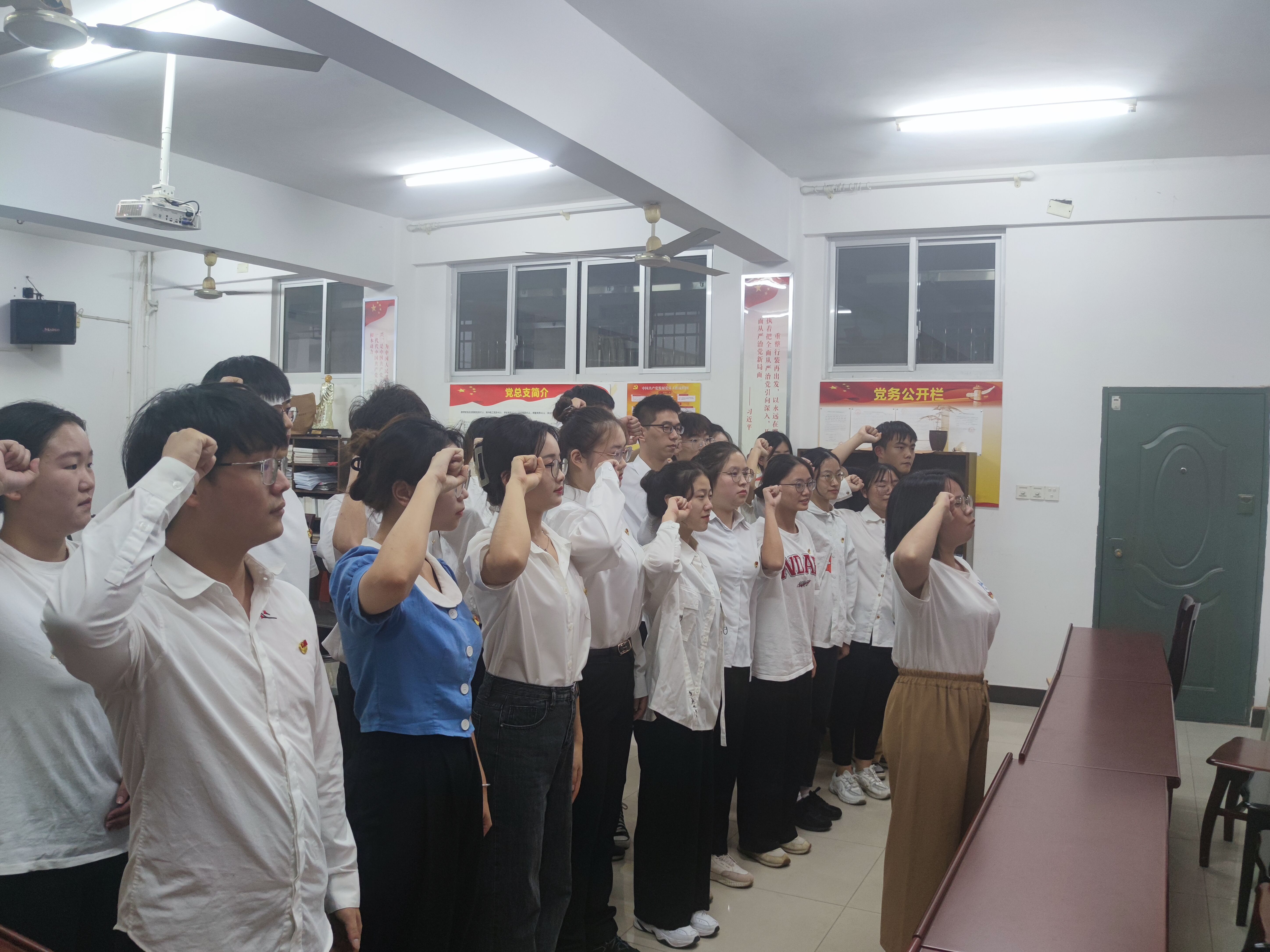 仪式在慷慨激昂的《国际歌》中正式拉开序幕,赵江南庄严宣读新党员名单。“我志愿加入中国共产党,拥护党的纲领,遵守党的章程……为共产主义奋斗终身,随时准备为党和人民牺牲一切,永不叛党!”在领誓人曹惠如的带领下,21名预备党员举起右手在党旗下许下铮铮誓言。